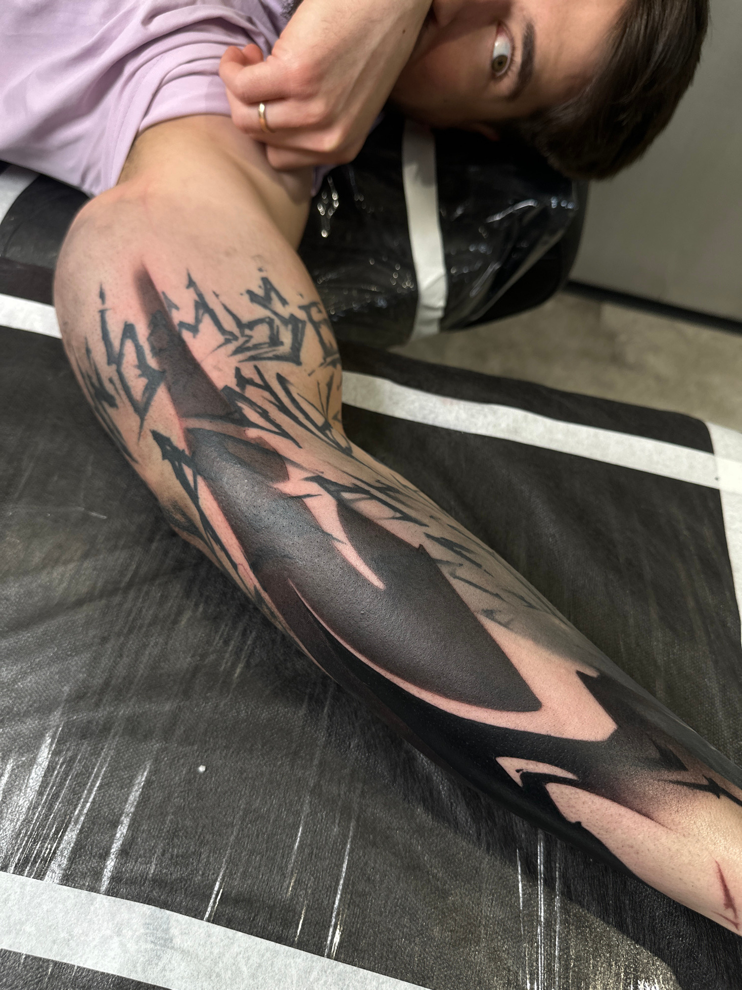 A high-angle, medium shot captures a person's arm adorned with a black abstract tattoo. The tattoo covers a significant portion of the forearm and extends towards the upper arm. The design incorporate…read more