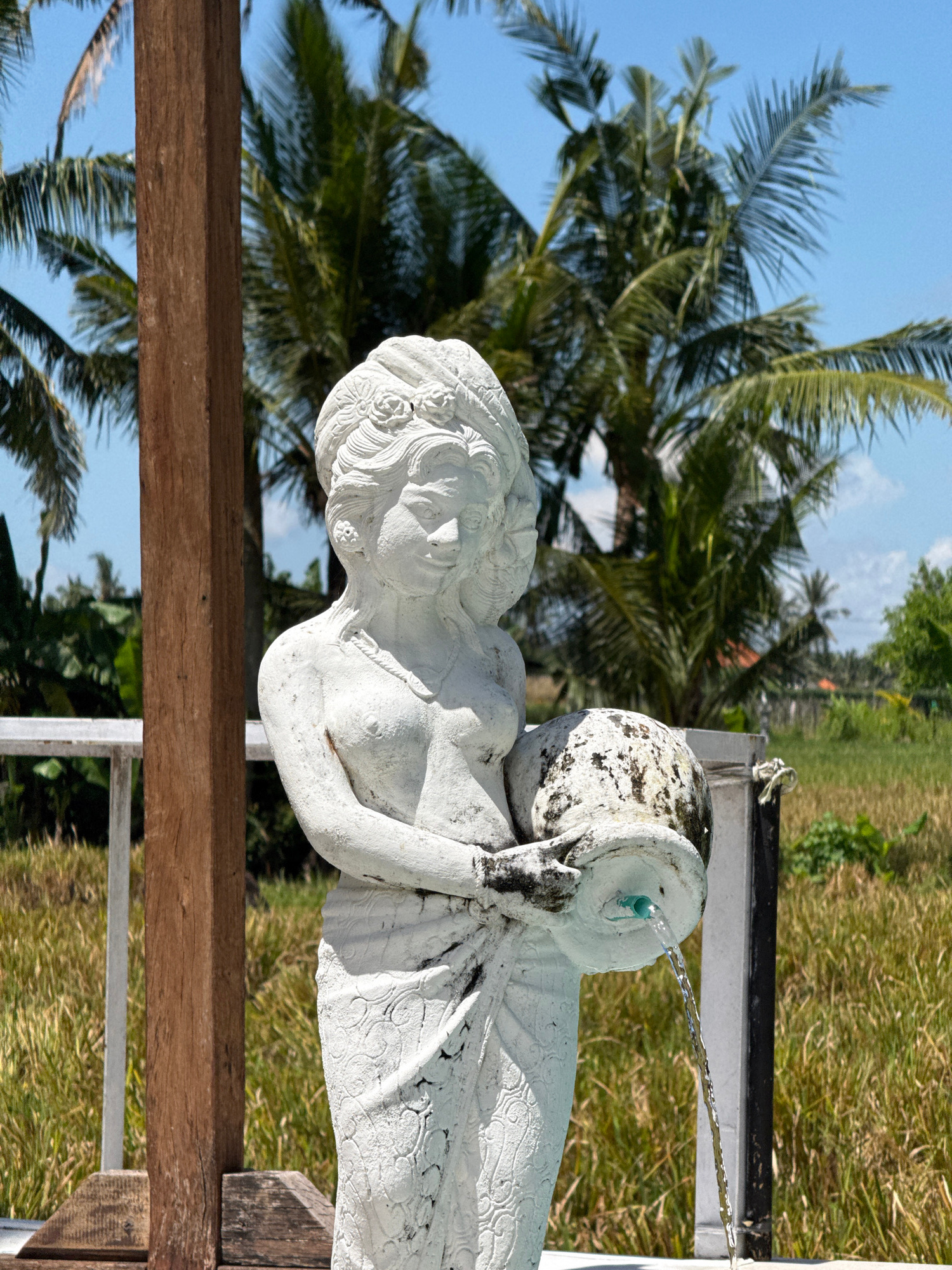 A sideways, eye-level shot shows a white, concrete statue of a woman holding a water vessel that emits two streams of water, located in Gubug, Indonesia. The statue rests on and is surrounded by a woo…read more
