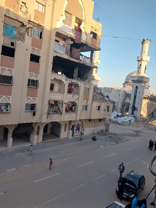 The image depicts a scene of extensive urban destruction, likely the aftermath of conflict or a major disaster. The overall setting is an outdoor street in what appears to be a Middle Eastern or North African city, given the architectural style including a prominent mosque. In the foreground and mid-ground, on the left side, stands a large, multi-story building that has sustained severe damage. Large sections of its facade are missing, exposing the building's interior rooms and structural components. Charred areas and debris are visible within the exposed sections, suggesting fire damage. Personal items, including clothes, are seen hanging from what were once balconies or windows, indicating that the building was inhabited. The building's exterior, where intact, is a light, sandy beige color with some decorative patterns. Further down the street, in the background, a white mosque with a tall minaret and a dome is visible. The minaret appears largely intact, though some wear or minor damage might be present at its pinnacle. The mosque structure itself, particularly its lower sections, also shows signs of damage, with rubble scattered around its base. An asphalt road runs across the lower portion of the image. It has clear white lane markings. On the right side of the road, a dark-colored sedan, possibly black, is parked or stationary. Adjacent to the road and surrounding the damaged buildings, piles of rubble, concrete fragments, and other debris are scattered, further emphasizing the scale of the destruction. Several people are visible in the scene, going about their daily activities amidst the ruin. A few individuals are standing near the parked car on the right. Other figures are walking or standing further down the street, closer to the mosque. One person is seen walking alone in the middle of the road in the foreground, and another is near the damaged building on the left. Their presence suggests an ongoing human presence and perhaps the initial stages of coping with or assessing the devastation. The time of day appears to be mid-morning or early afternoon, indicated by the bright, clear blue sky and the distinct shadows cast by the buildings and people. The weather is fair and sunny. No discernible text is visible in the image. The scene conveys a powerful sense of loss and the profound impact of destructive events on urban environments and the lives of their inhabitants. | Open Wire