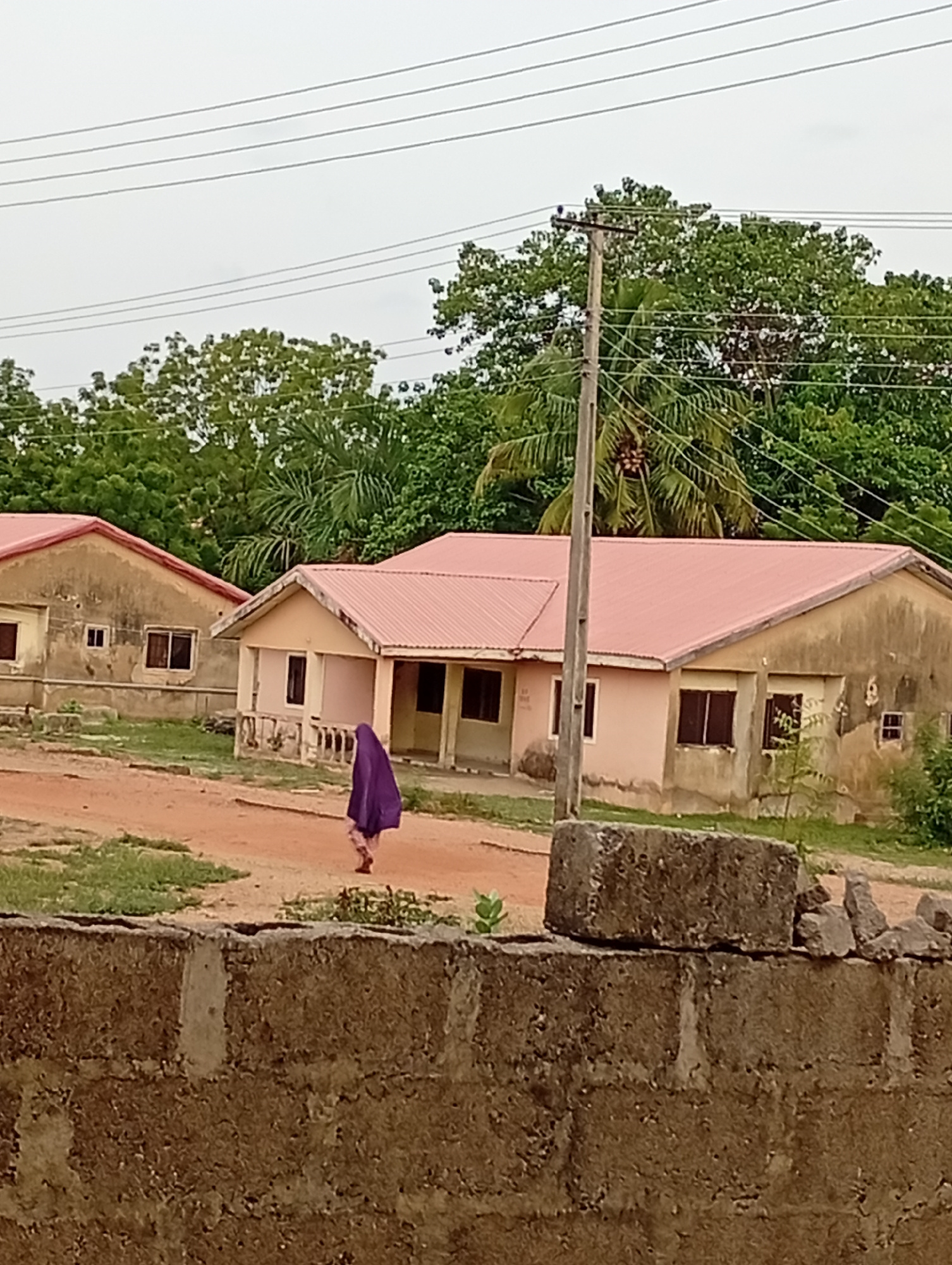The image depicts a scene in Adankolo, Nigeria, featuring two adjacent buildings with reddish-pink roofs and beige-colored exteriors. The buildings appear to be in a state of disrepair. A woman wearinβ¦read more
