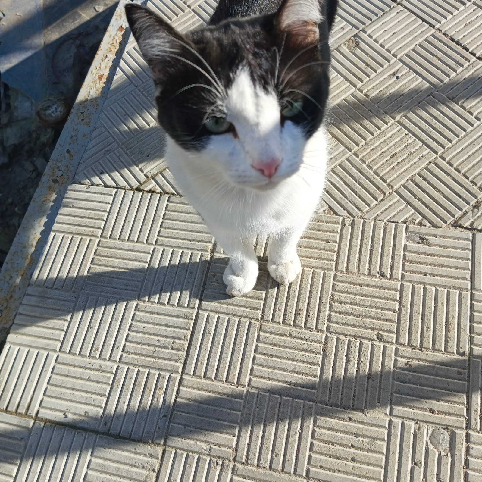 An eye-level shot captures a black and white cat standing on a patterned concrete surface. The cat, a tuxedo cat with distinct black patches on its head, ears, and back, and white fur on its face, che…read more