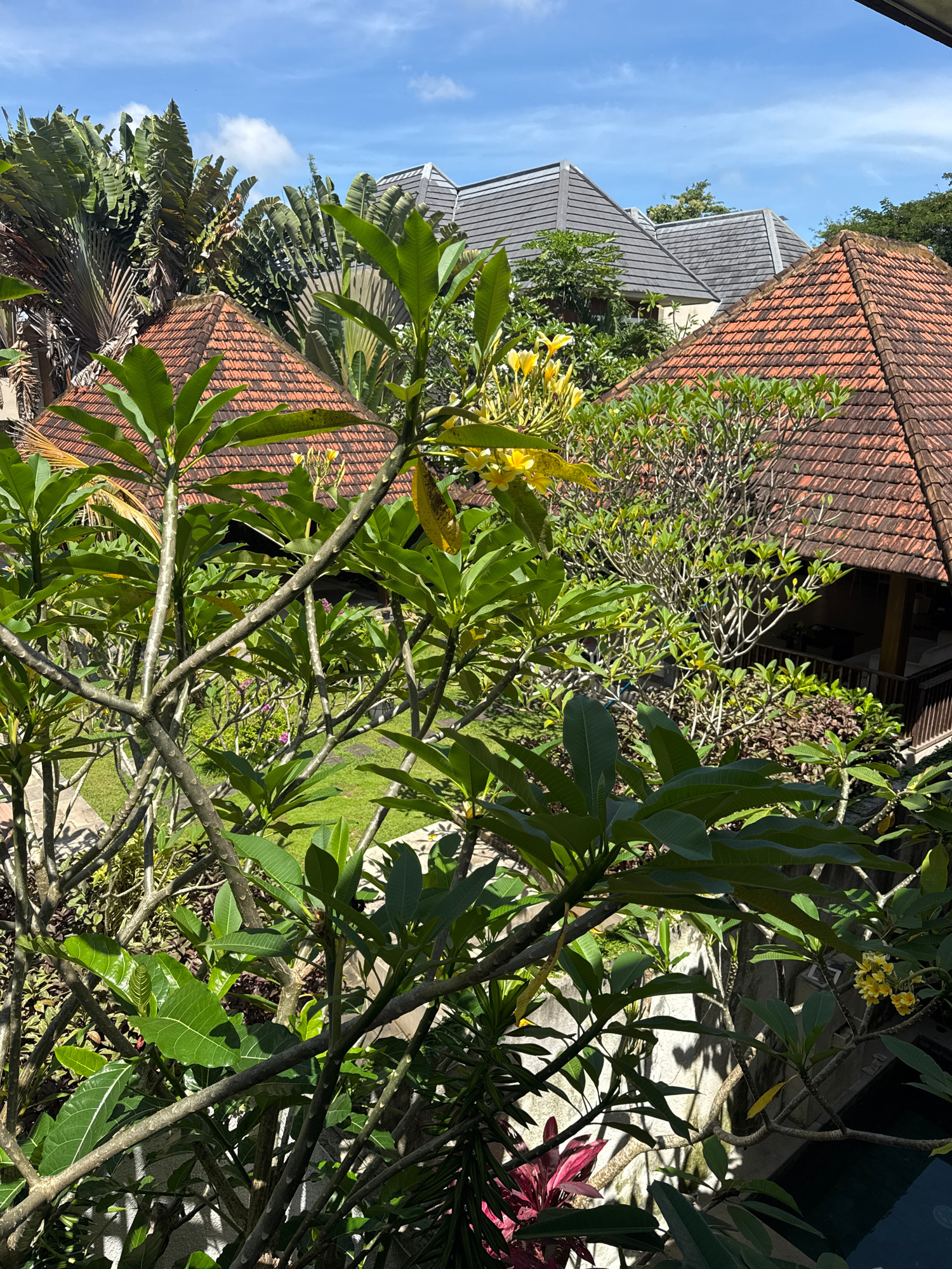 The scene depicts a close-up, elevated view of a garden setting, showcasing a mix of tropical vegetation and architectural elements, potentially in Unknown, Unknown. Dominating the view are branches of a plumeria tree with bright green leaves and clusters of yellow flowers. The background reveals rooftops with red clay tiles and grey shingle roofing, suggesting residential structures. Various plant species contribute to the lush garden environment, including palm trees and other green foliage. The sky is partially visible with a clear blue color and wisps of clouds. The overall impression is one of a serene, well-maintained tropical garden. | Open Wire