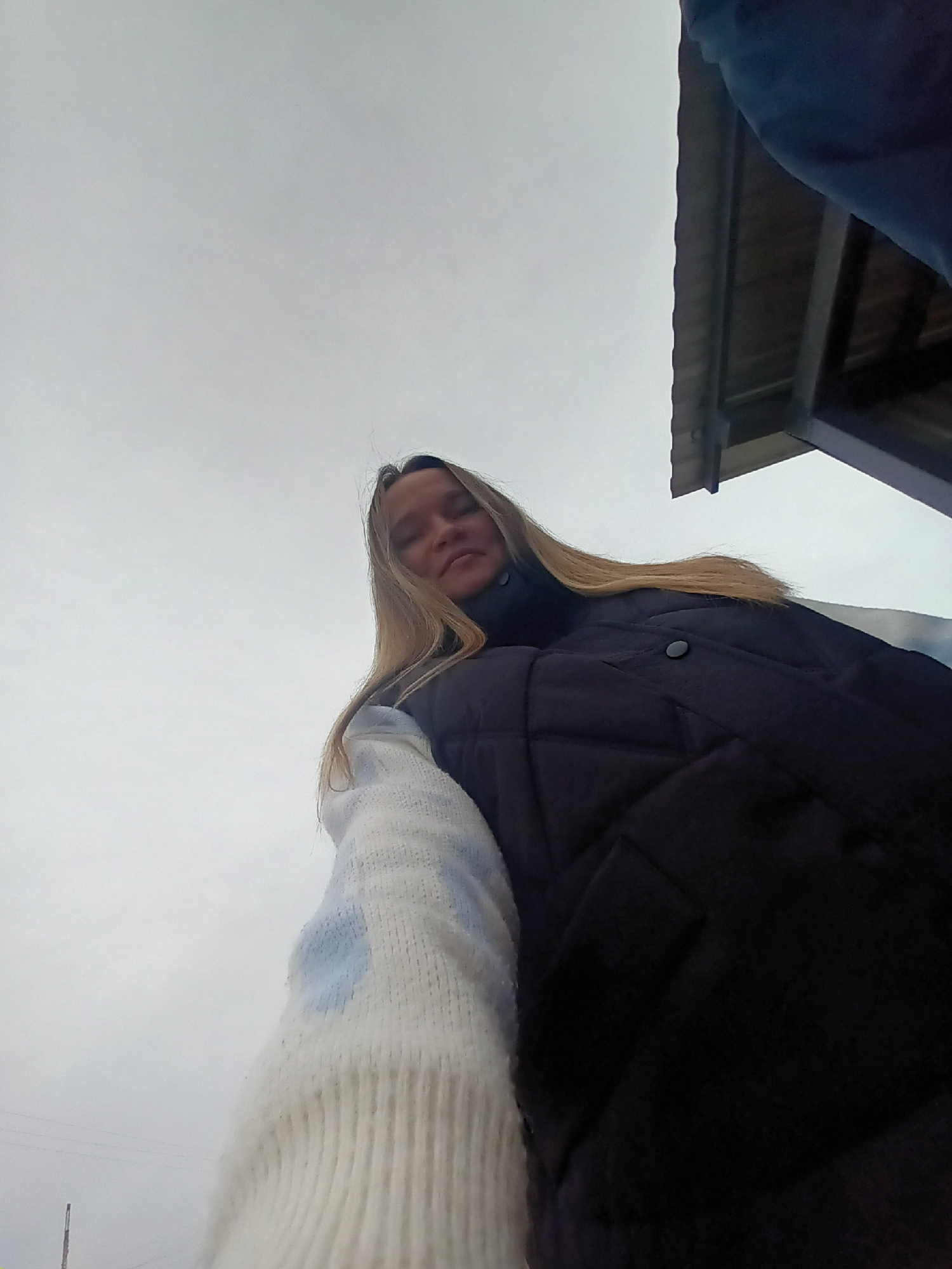 A woman with blonde hair is looking down at the camera. She is wearing a black jacket and a white and blue striped sweater. The sky is grey and overcast. In the upper left corner, there is a building.…read more