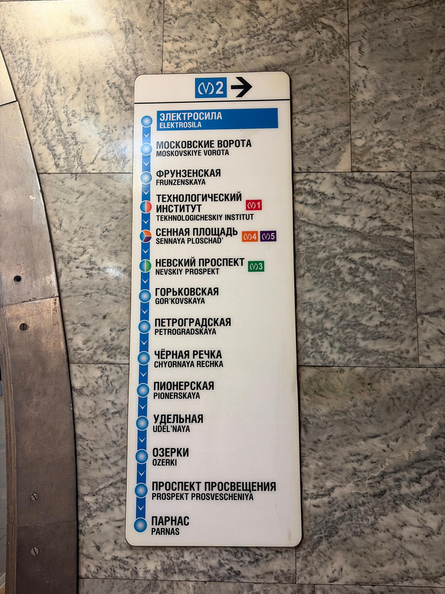The image shows a sign from the Saint Petersburg Metro, Russia. The sign displays the stations on Line 2 (blue line) going towards Parnas. The stations listed include Elektrosila, Moskovskiye Vorota,…read more