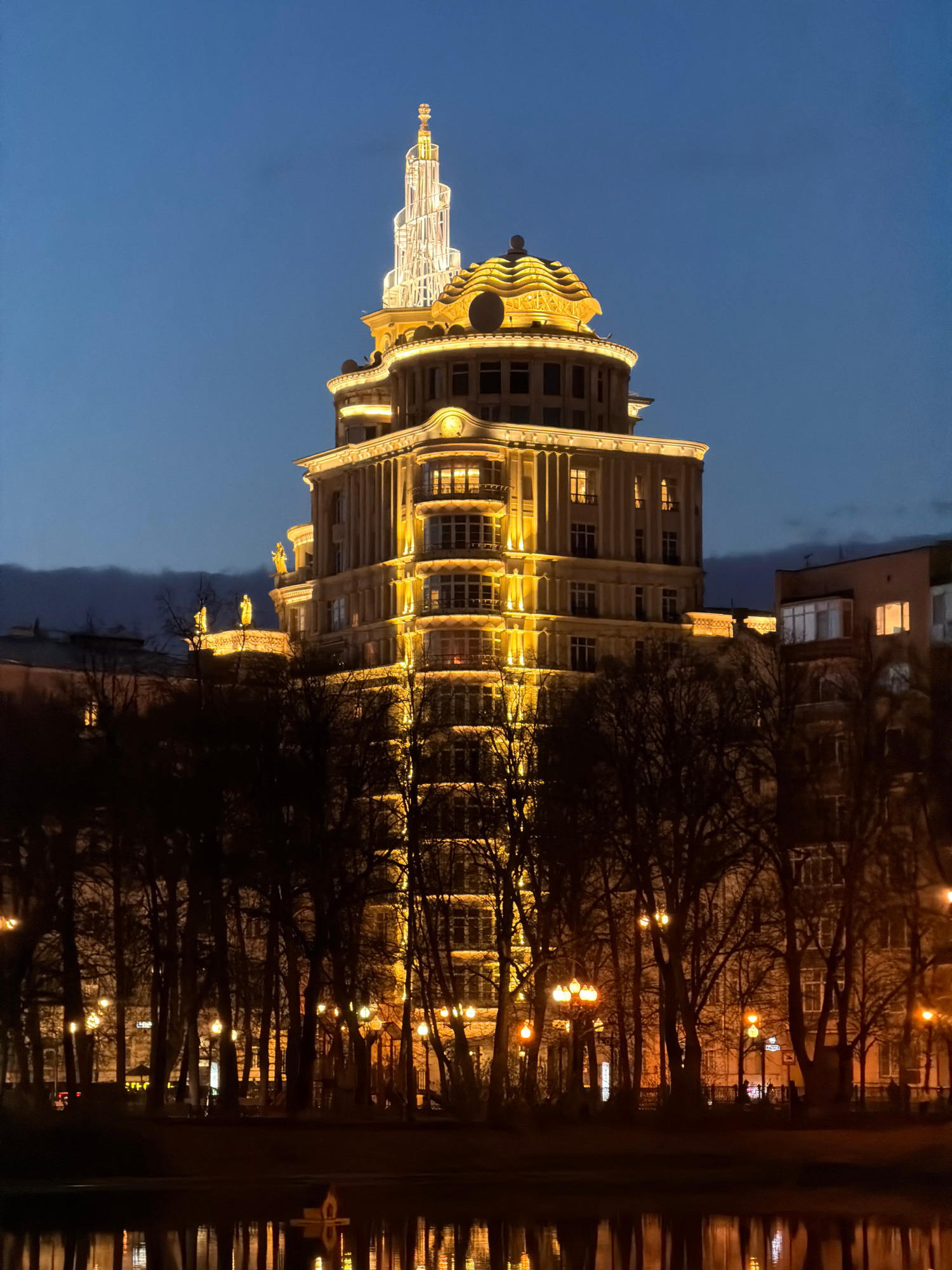 The image depicts a nighttime view of the Kudrinskaya Square Building, one of the "Seven Sisters" skyscrapers in Moscow, Russia. The building is illuminated with warm lighting, highlighting its archit…read more