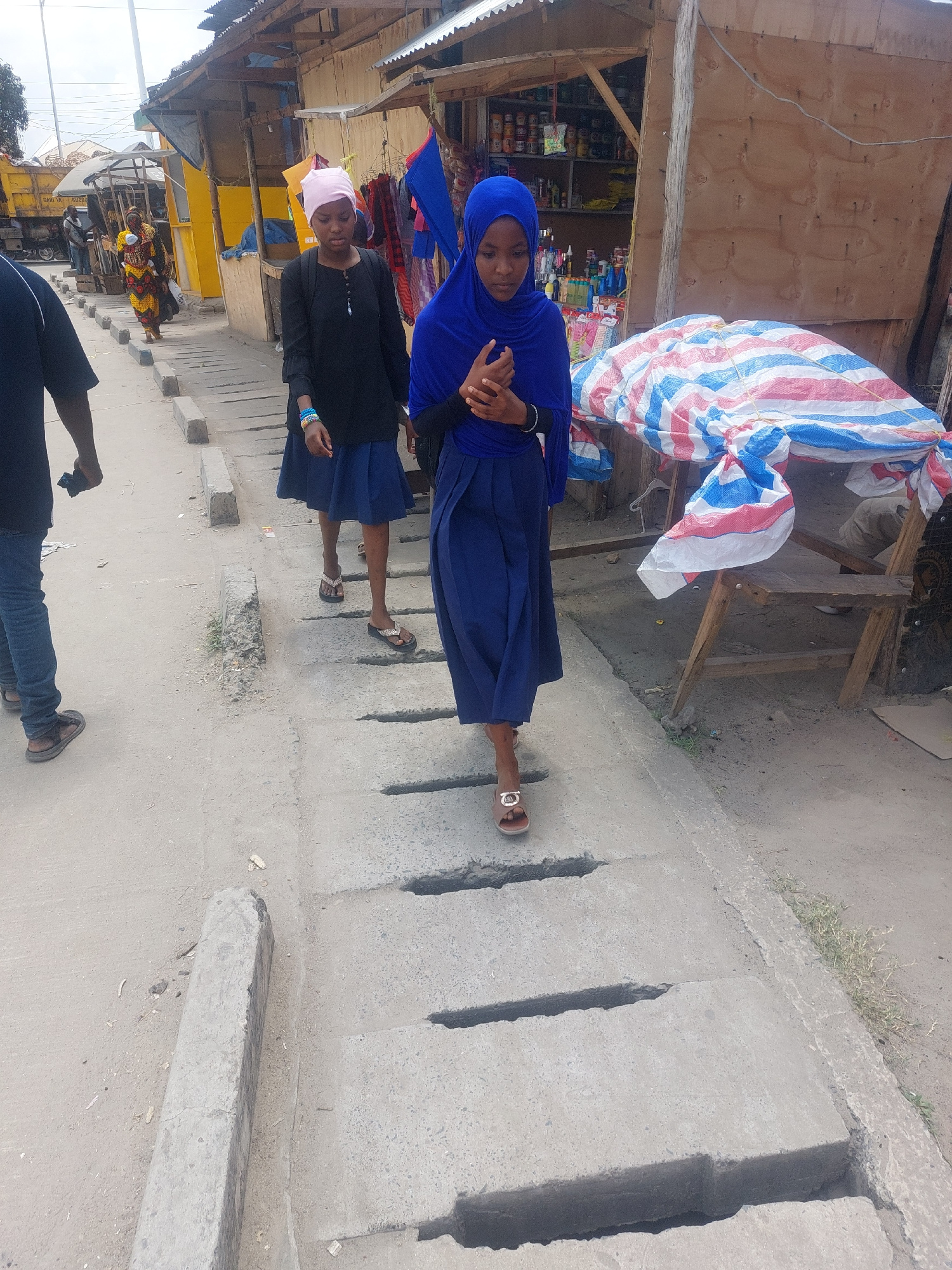 Two young women stand on a concrete sidewalk alongside an open market. The first woman wears a bright blue hijab, a blue top, and a long blue skirt. The second wears a light pink head covering, a blac…read more