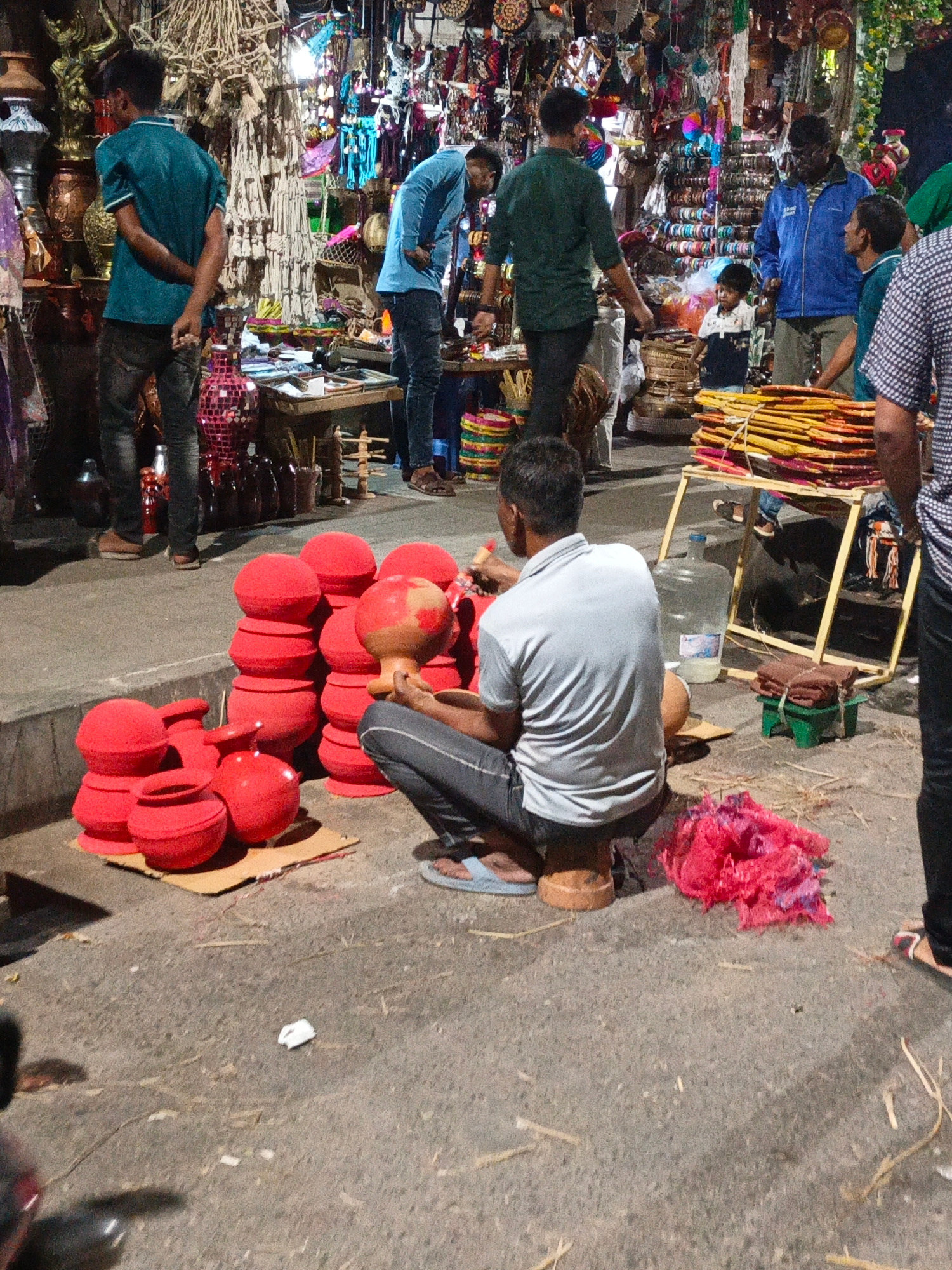 The image shows a street scene, likely in Dhaka, Bangladesh, based on the dense market environment and the products sold. A man sits on a small wooden stool, painting a clay pot with red paint, surrou…read more