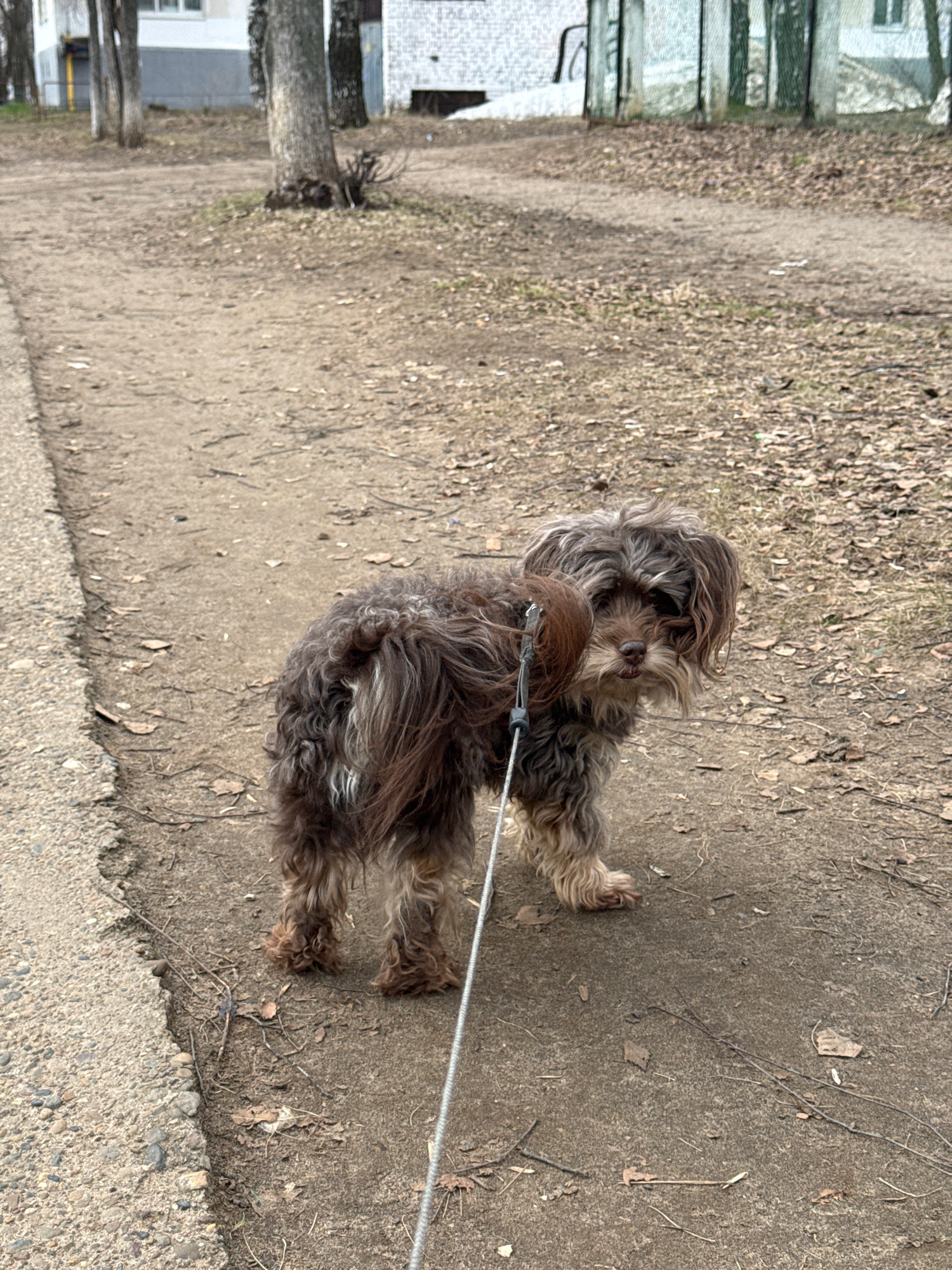 A medium-sized, long-haired dog with a brown and grey coat stands on a dirt path. The dog is on a leash that extends out of the frame towards the right. The path is flanked by a grassy area with falle…read more