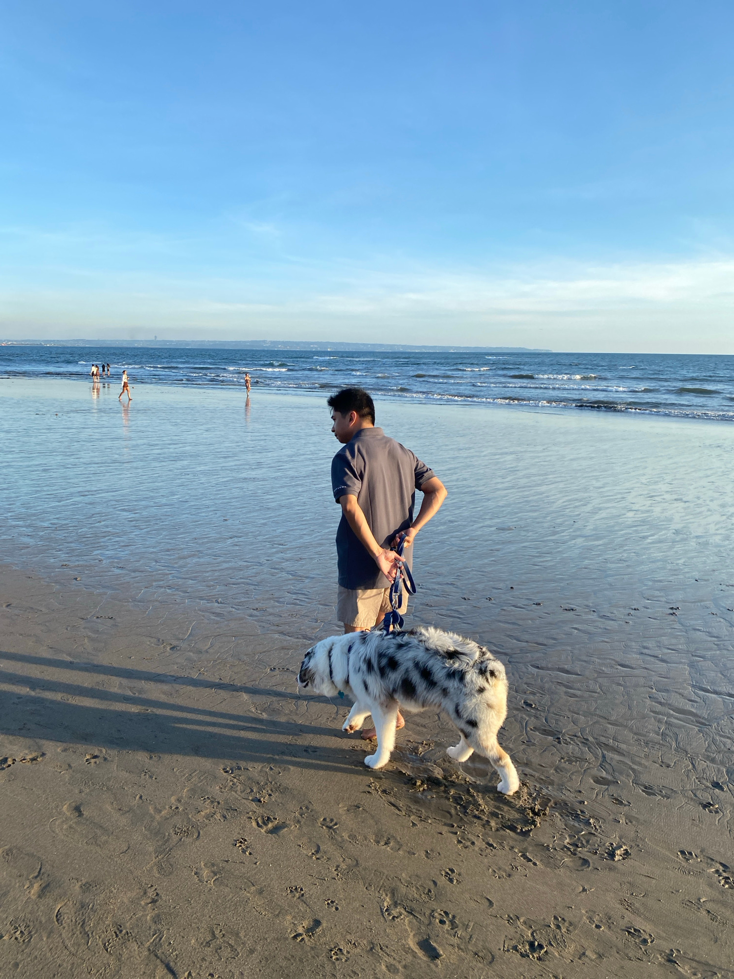 A man stands on a beach beside a dog. The man is holding a leash. The dog is white and black spotted. The beach has wet sand near the water and dry sand further up. The water is visible and there are…read more