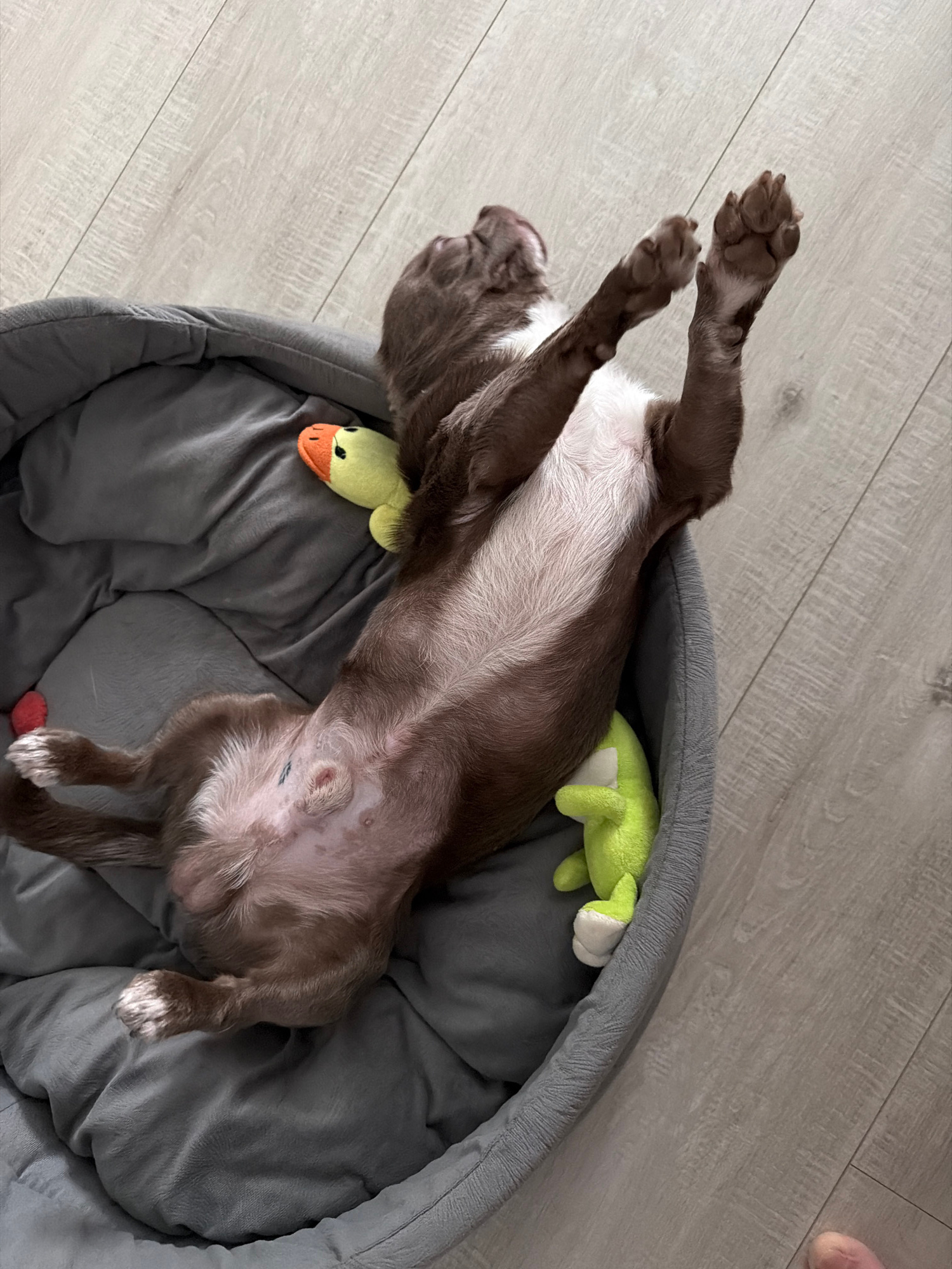 A brown and white dog is lying on its back in a gray dog bed on a light gray wooden floor. The dog has its front paws raised in the air. There is a green stuffed frog and a yellow stuffed duck in theβ¦read more