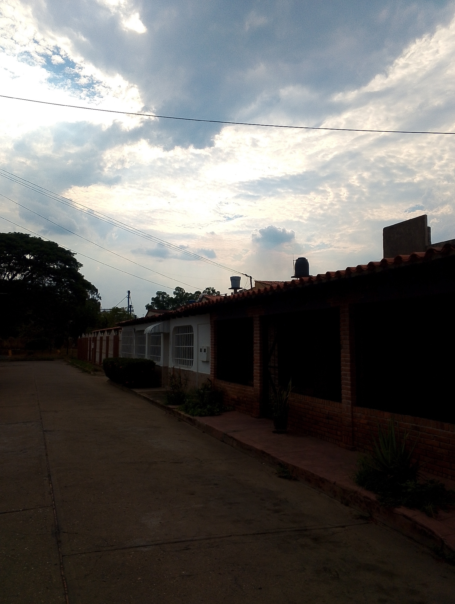 The image presents a street scene in San Carlos, Venezuela. The foreground is dominated by a paved road, receding into the distance. Along the right side of the road is a row of low, single-story buil…read more