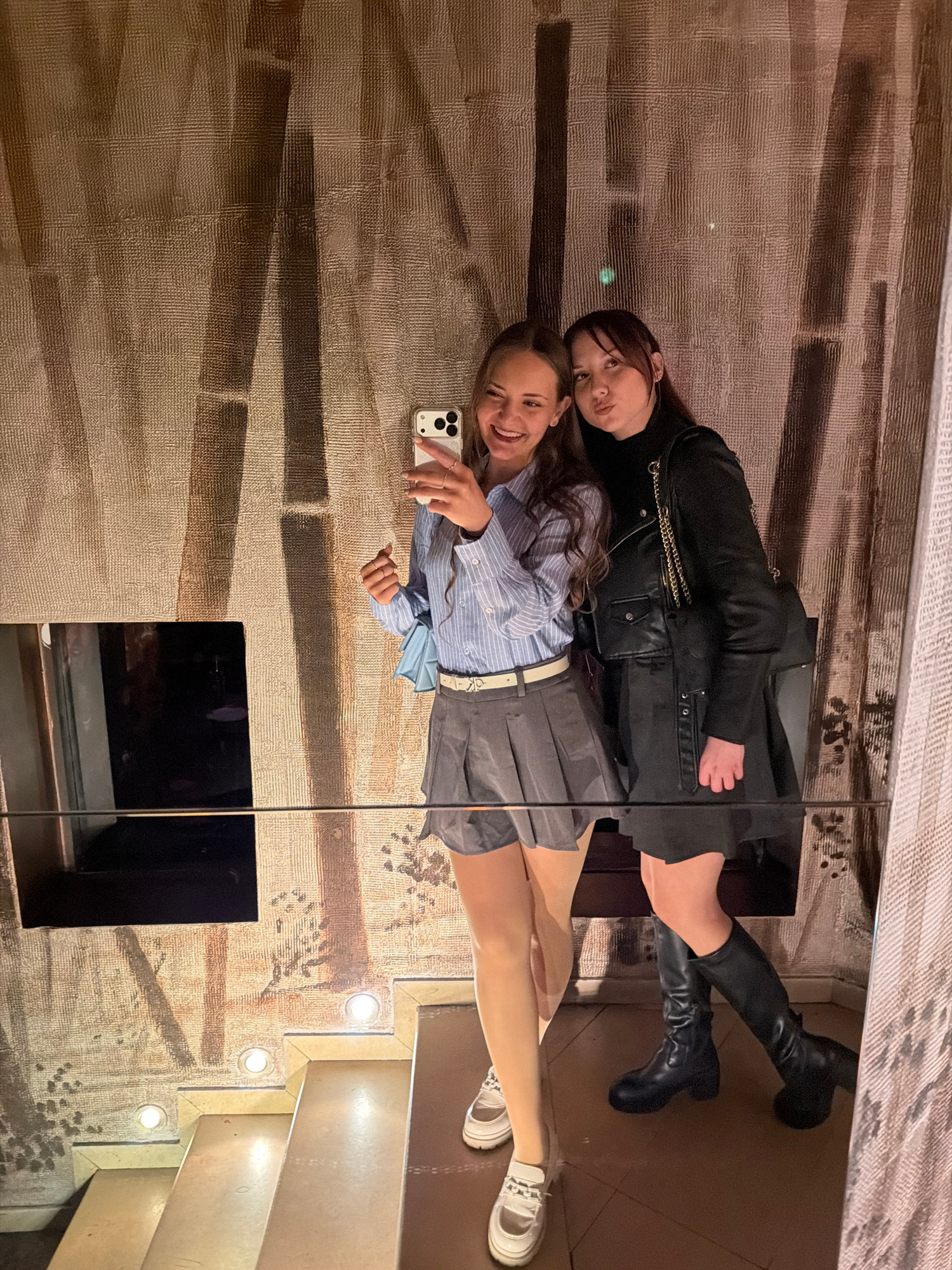 Two young women are posing for a selfie in front of a large mirror. The woman closer to the camera is holding a white smartphone. She is wearing a blue striped shirt, a gray pleated skirt with a whiteβ¦read more