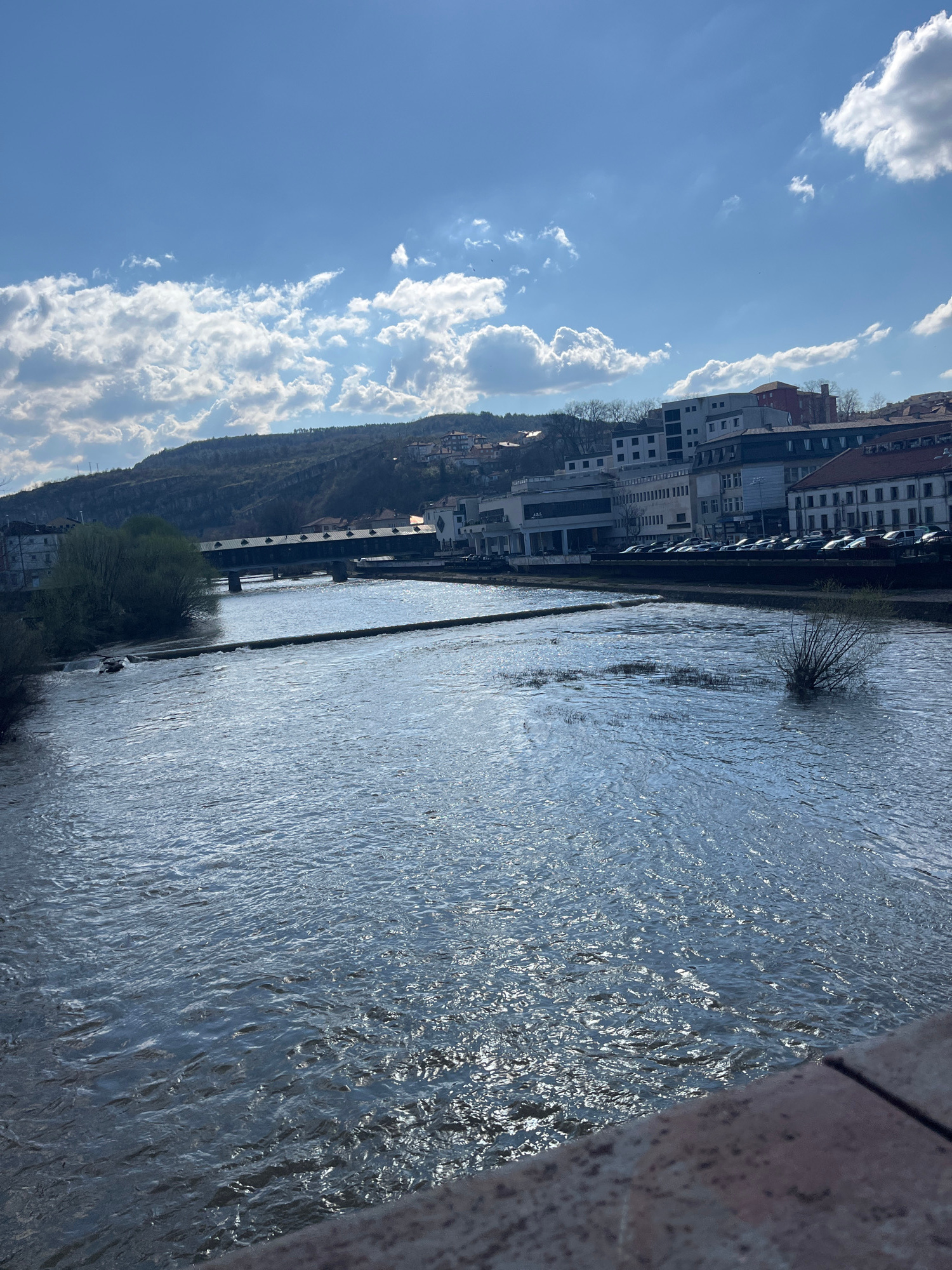 This image, oriented vertically, showcases a view of Lovech, Bulgaria. The scene primarily features a river in the foreground, its surface textured with ripples. The opposite bank is lined with buildi…read more