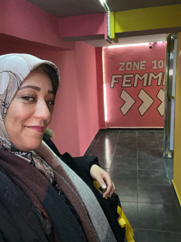 A woman wearing a headscarf sits indoors, possibly waiting in an area marked "ZONE 10 FEMMES" with arrows pointing in a specific direction. The room features a pink floor and wall, accented by yellow…read more