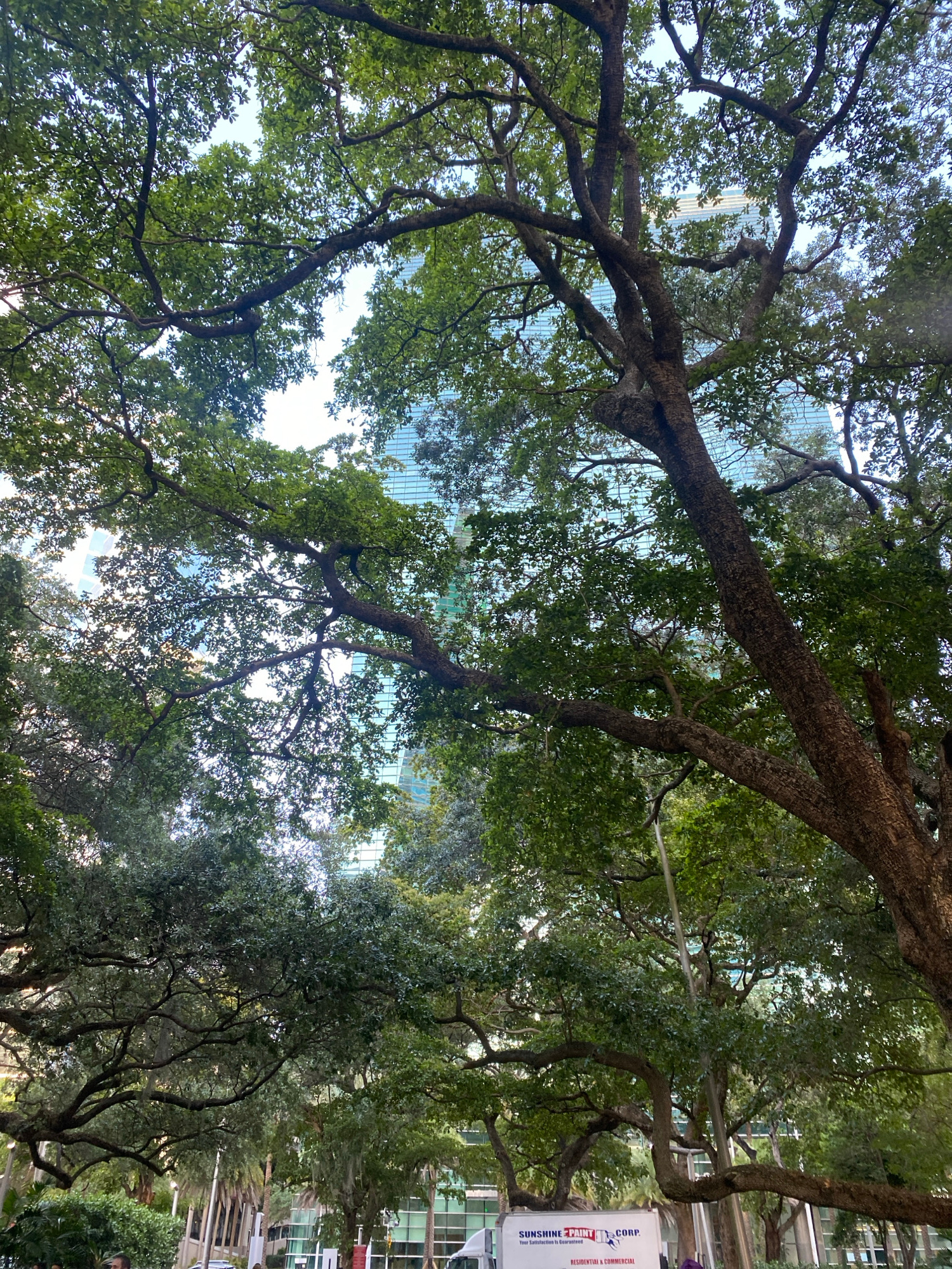 The image shows a view looking up through the dense canopy of trees in an urban setting. The branches are gnarled and thick, with green leaves. A building is visible through the branches, it is an off…read more