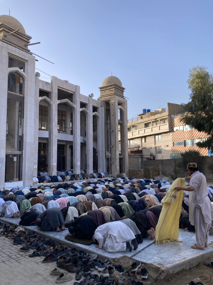 The scene depicts a large outdoor congregational prayer in Quetta City Tehsil, Pakistan. Approximately 100 to 150 men are observed prostrating (performing sajdah) on an elevated concrete platform. The…read more