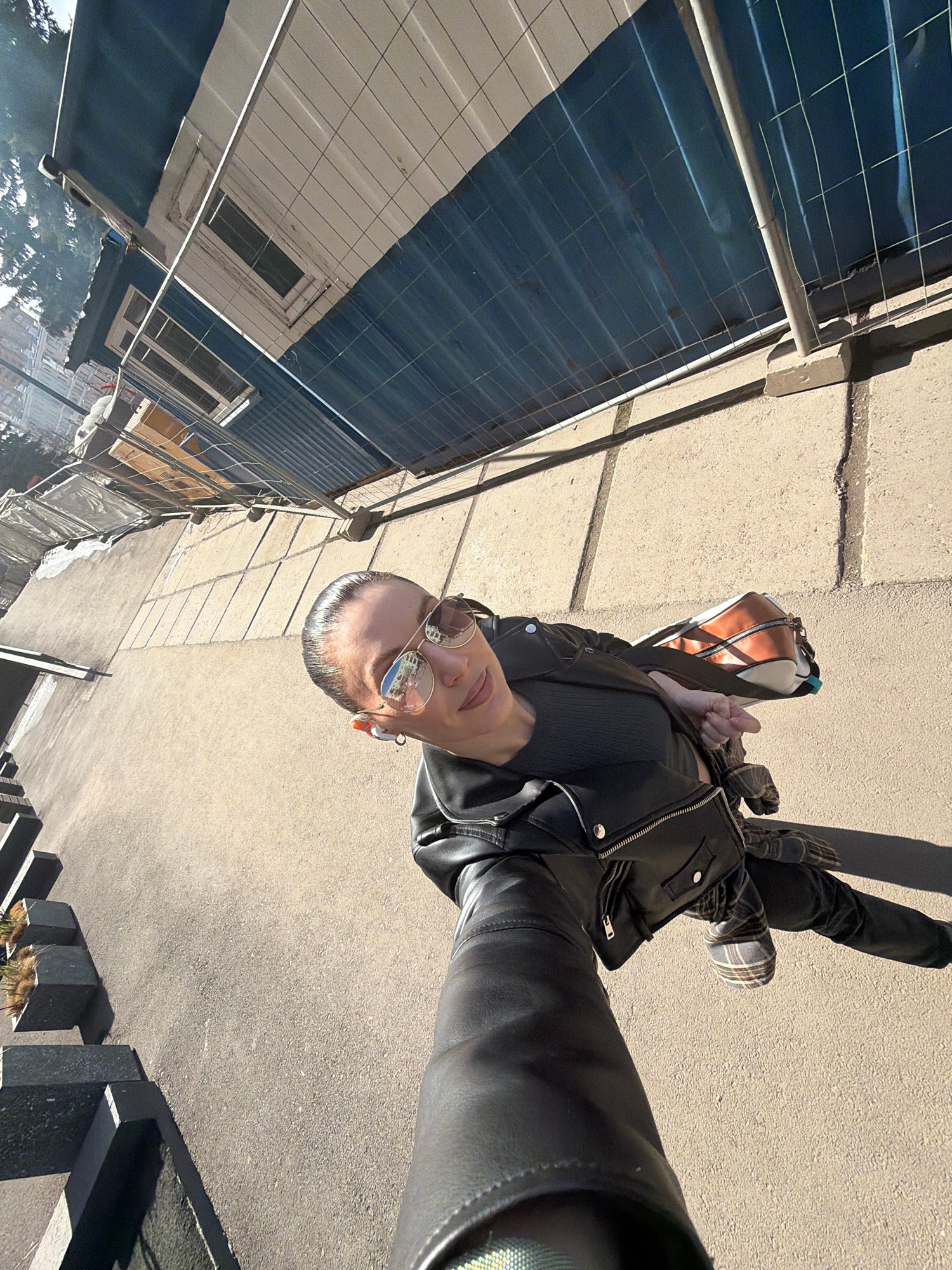 A person takes a selfie outdoors on a sunny day. The person is wearing a black leather jacket, black shirt, dark pants, and round sunglasses, and carrying a bag. They are standing on a gray paved surf…read more