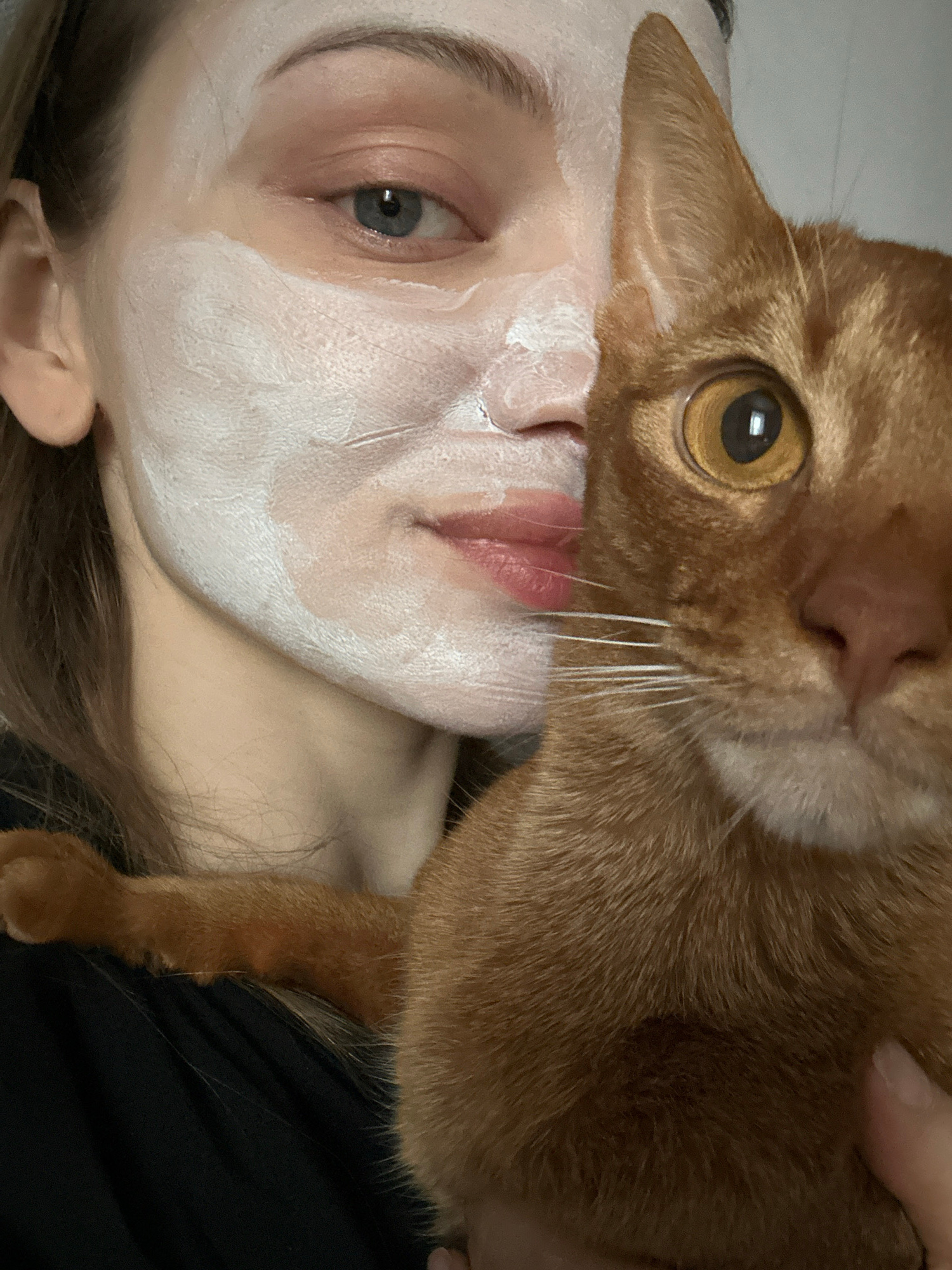 A fair-skinned person lies on their back, face up, with a white facial mask applied. An orange tabby cat is positioned with its head and front paw resting against the person's face. The cat's eye is o…read more