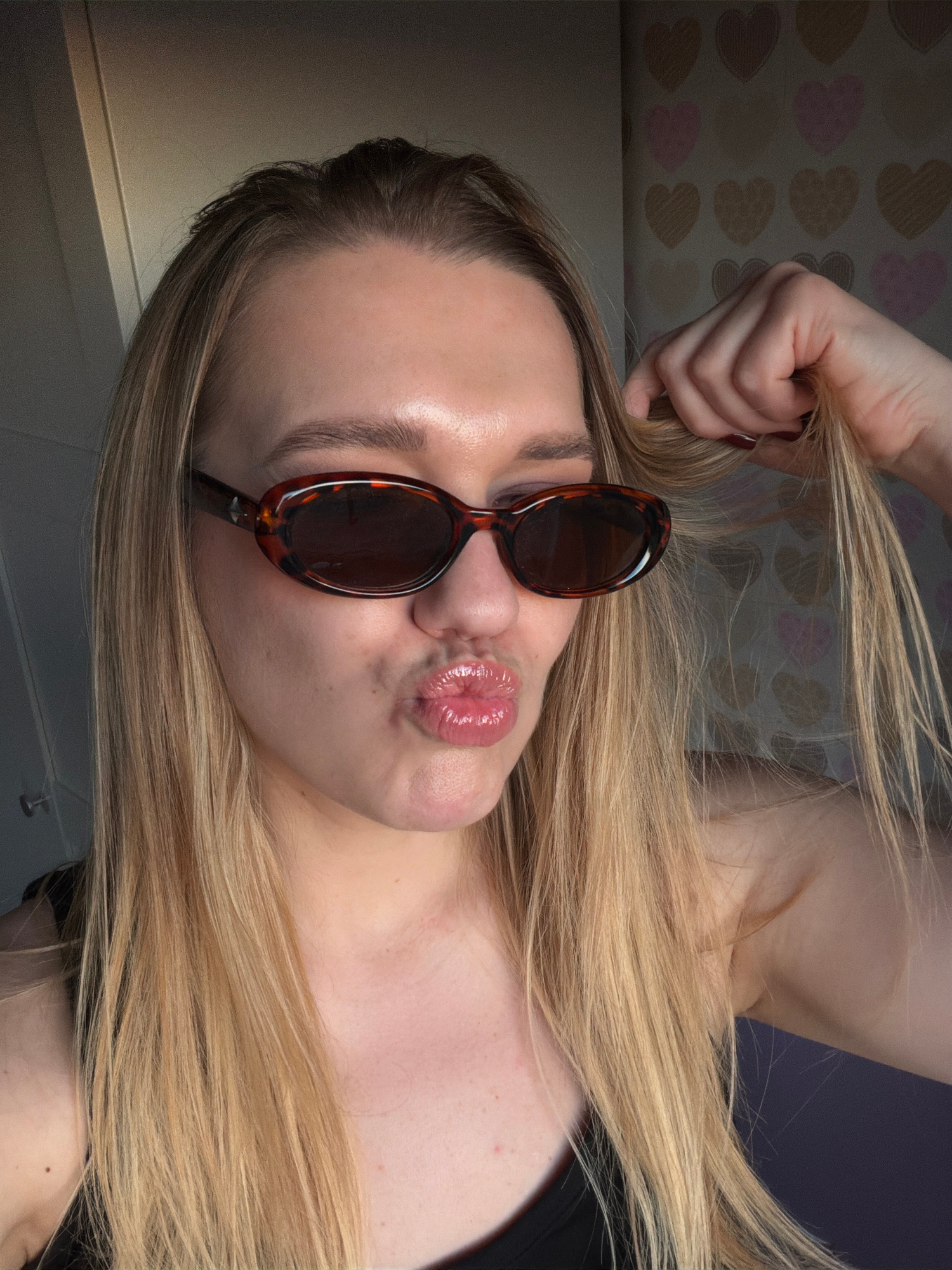 A woman is lying down, facing upwards, with a pair of sunglasses resting on her nose. Her blonde hair is spread around her, and she is holding a strand of it in her right hand. Her lips are pursed. Th…read more
