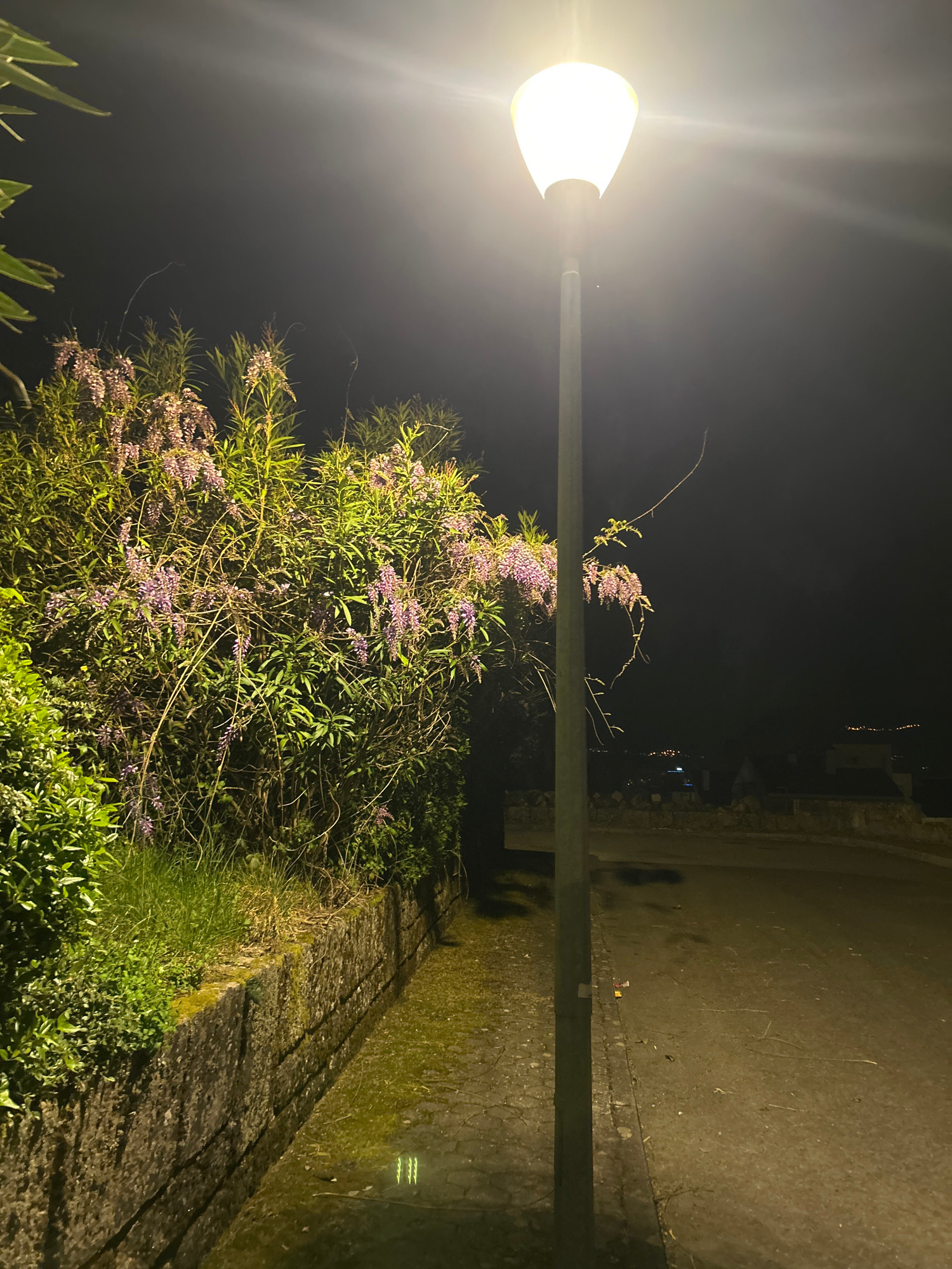 The image depicts a nighttime scene in Vila Real, Portugal. A street lamp illuminates a flowering bush. The lamp's light casts a glow on the surrounding area, including a stone wall and a paved walkwa…read more
