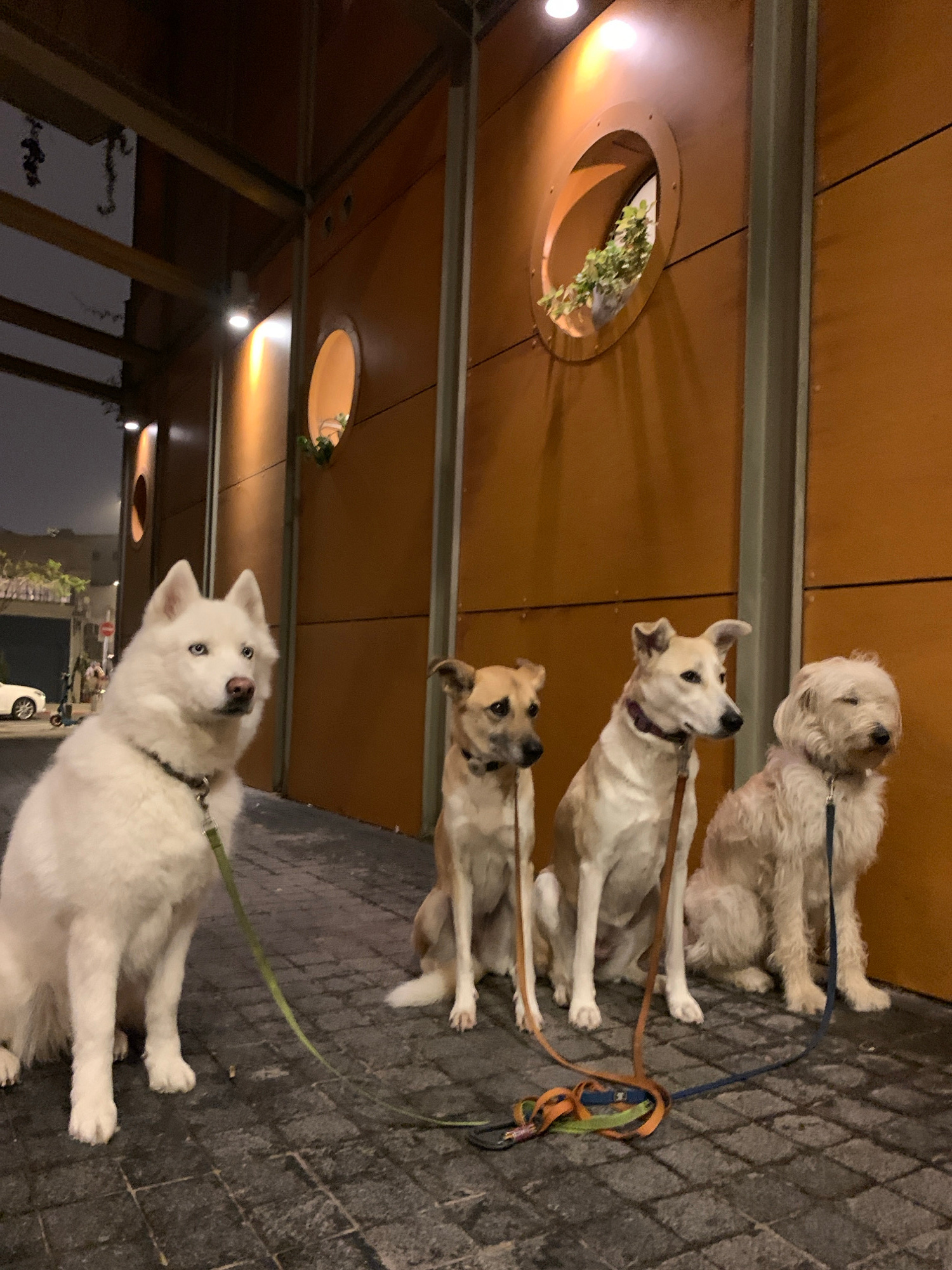 Four dogs of varying breeds sit on a gray brick sidewalk adjacent to a modern building. The building has a wooden facade with round cutouts containing plants. Streetlights are visible in the distance,…read more