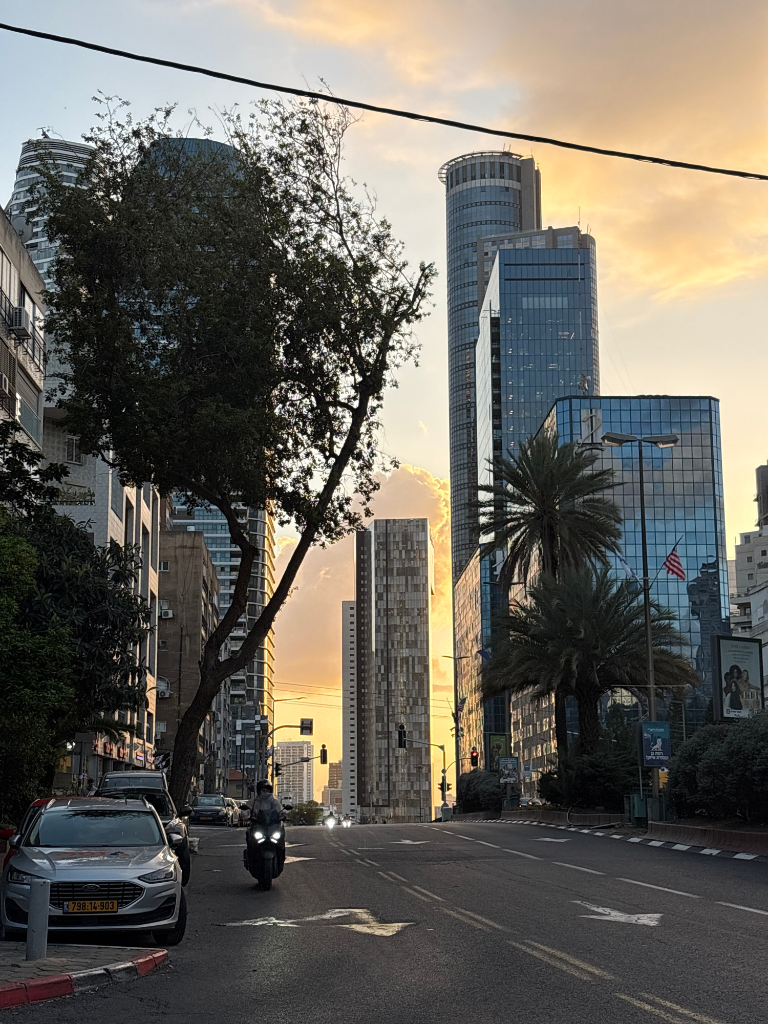The image is a street-level view in Ramat Gan, Israel. The sky is bright with the setting sun. There are several modern buildings of varying heights including one with the flag of the United States. T…read more
