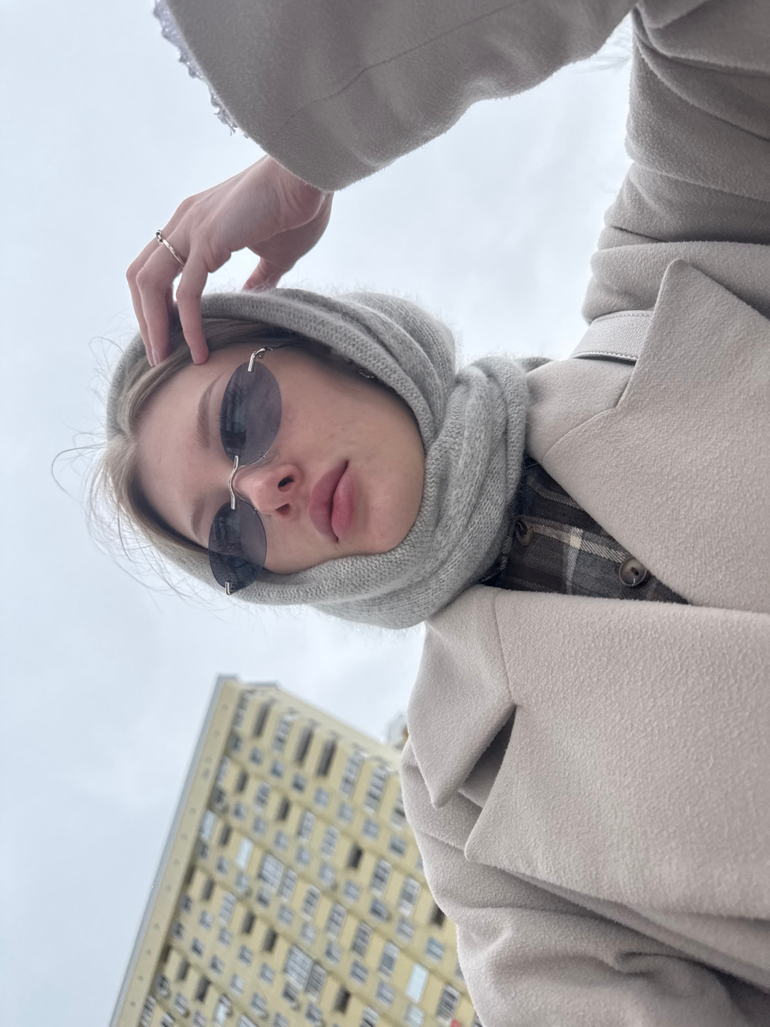 An upside-down, low-angle shot depicts a person looking downwards, seemingly taking a selfie. The person is dressed in winter attire, including a light beige overcoat worn over a plaid shirt. A grey k…read more