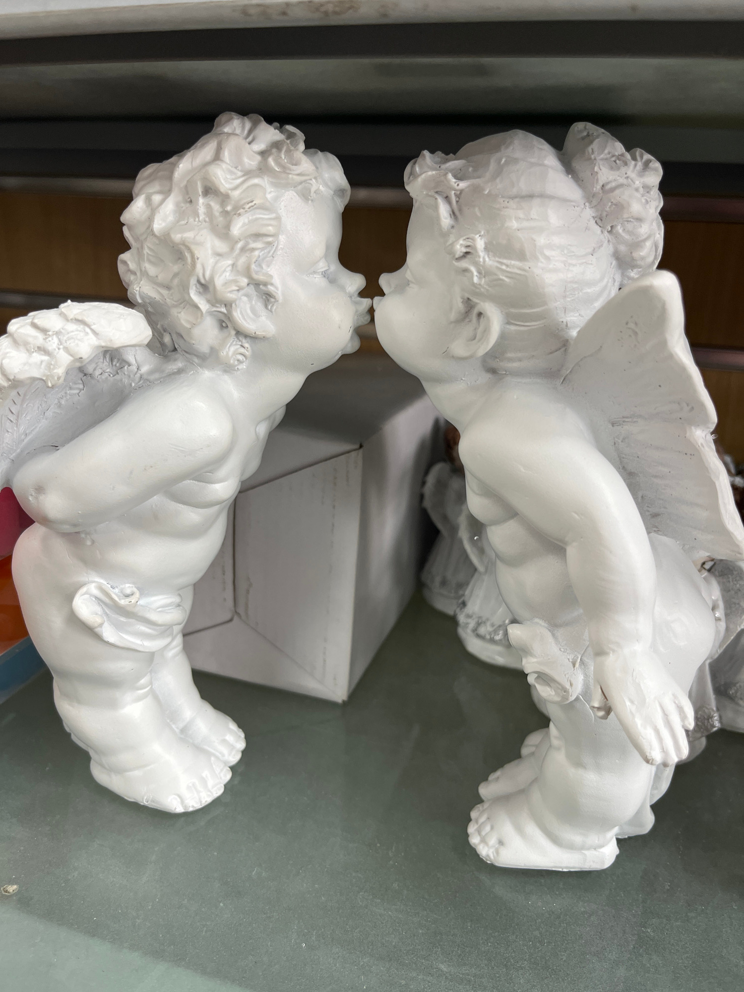 Two white, plaster cherubs are positioned near each other, appearing to face each other. A plain white box is situated between them, partially obscured. The background appears to be a dull, neutral su…read more