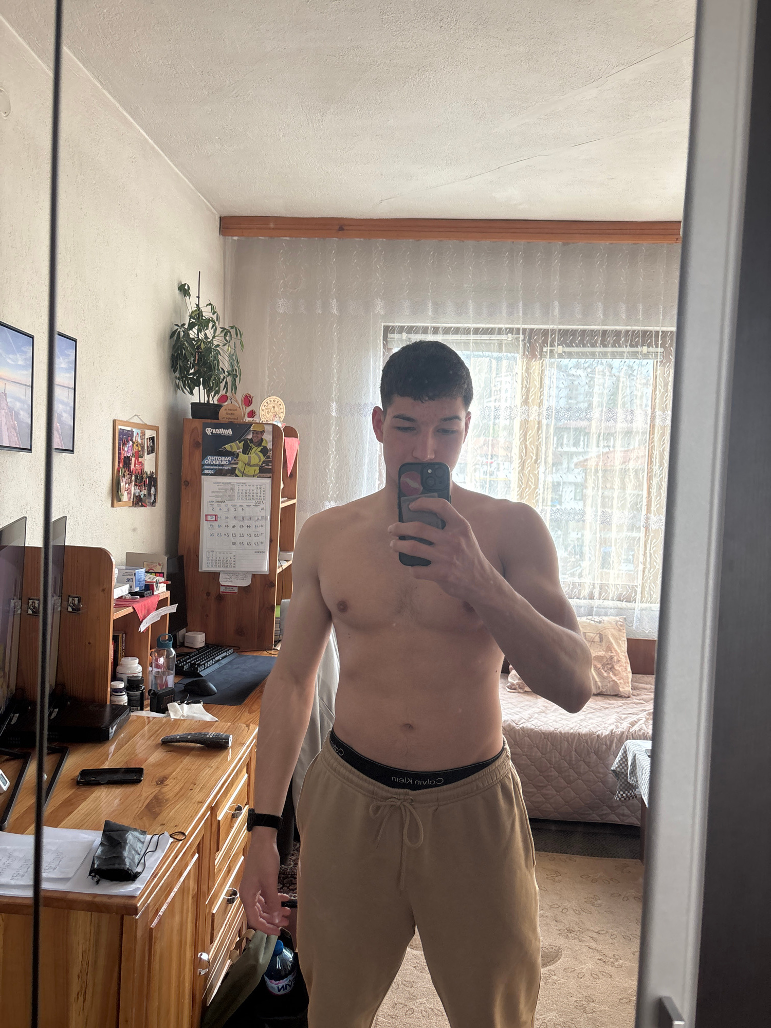A shirtless man in light brown sweatpants is taking a selfie in a mirror. He is standing in a room that appears to be in a home or apartment, with a bed visible in the background. To the right is a wo…read more