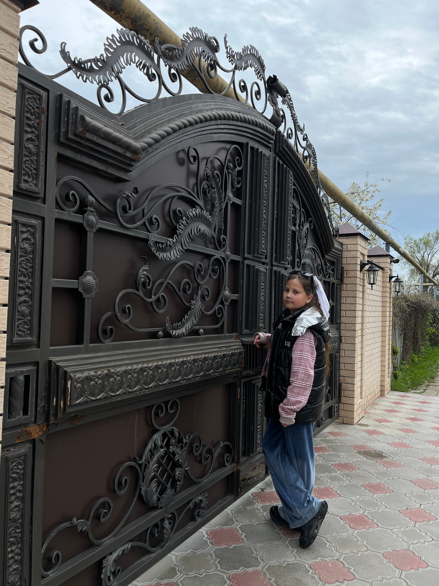 The image, taken in Novopokrovskaya, Russia, depicts a young girl standing beside a large, ornate wrought iron gate, likely marking the entrance to a private property. The image is oriented vertically…read more