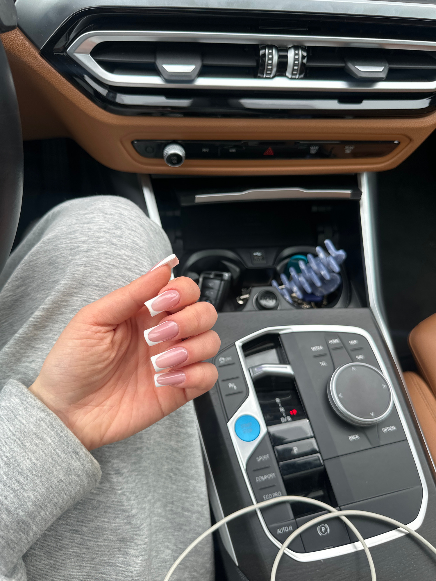 The image presents an interior view from a vehicle, specifically a modern BMW model, characterized by its brown leather dashboard trim, silver-accented air vents, and contemporary central console. The…read more
