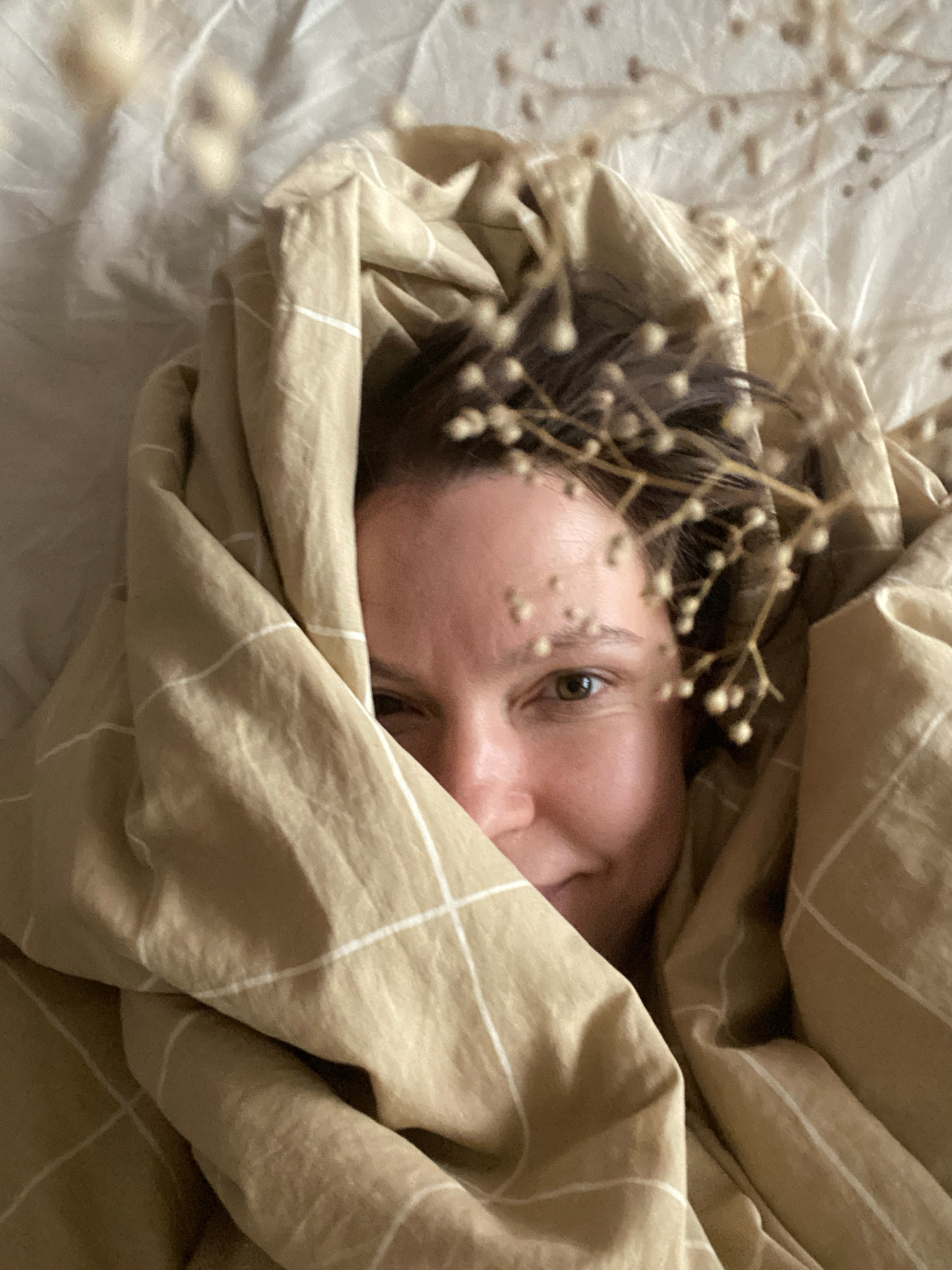 A person is partially visible beneath a tan and white plaid duvet. A dried flower stem with small spherical seed pods is near the person's face. The visible portion of the person includes part of thei…read more