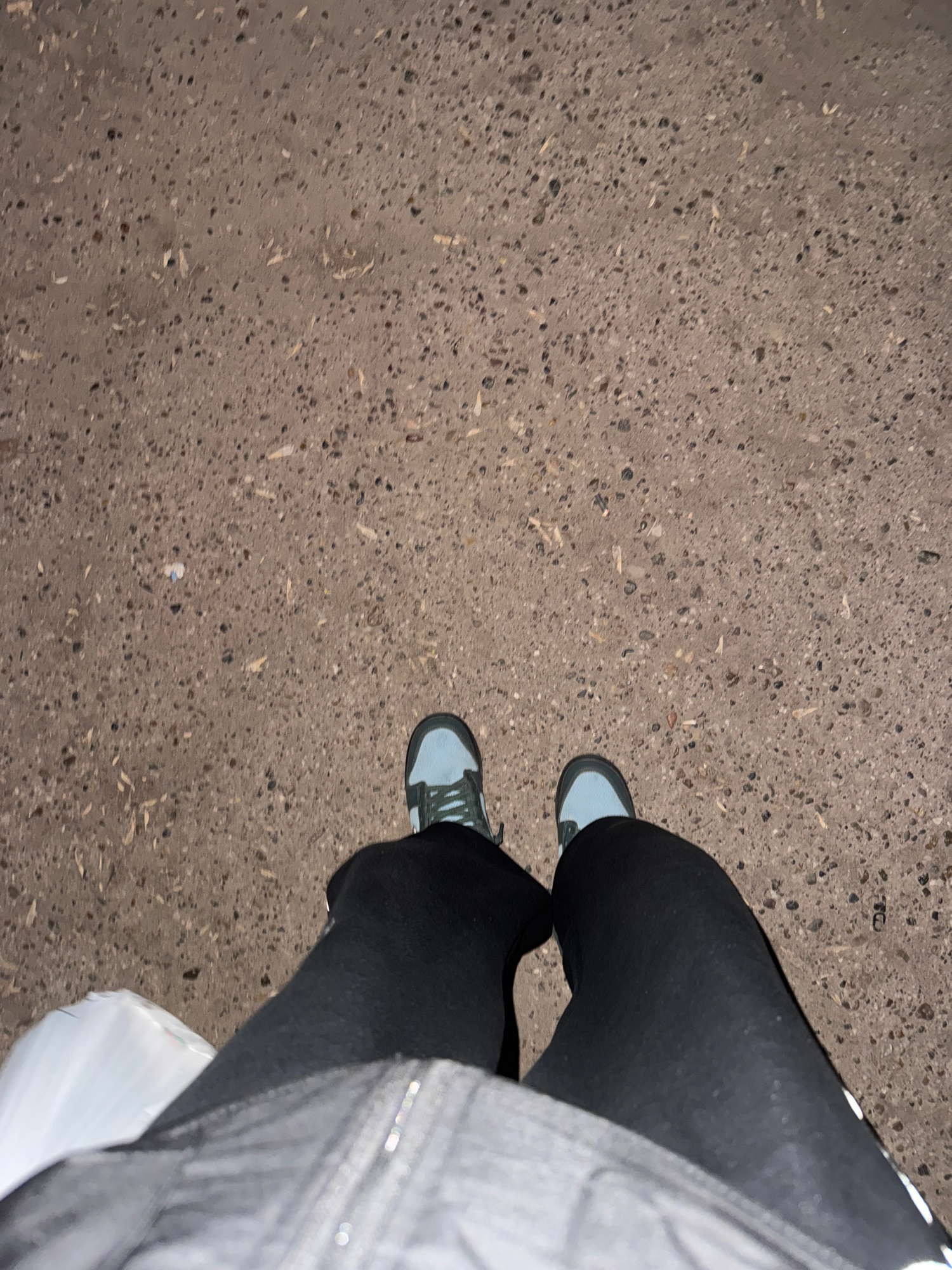 The image shows a top-down view of a person's lower body, focusing on their feet and the ground beneath. The person is wearing dark-colored pants or leggings and light blue or grey sneakers with darkeβ¦read more