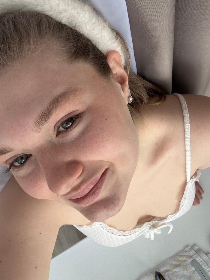 A young adult female is depicted in a high-angle, upward-looking portrait. She has fair skin, green eyes, and light brown hair, which is partially concealed by a white fuzzy headband. A small, clear,…read more