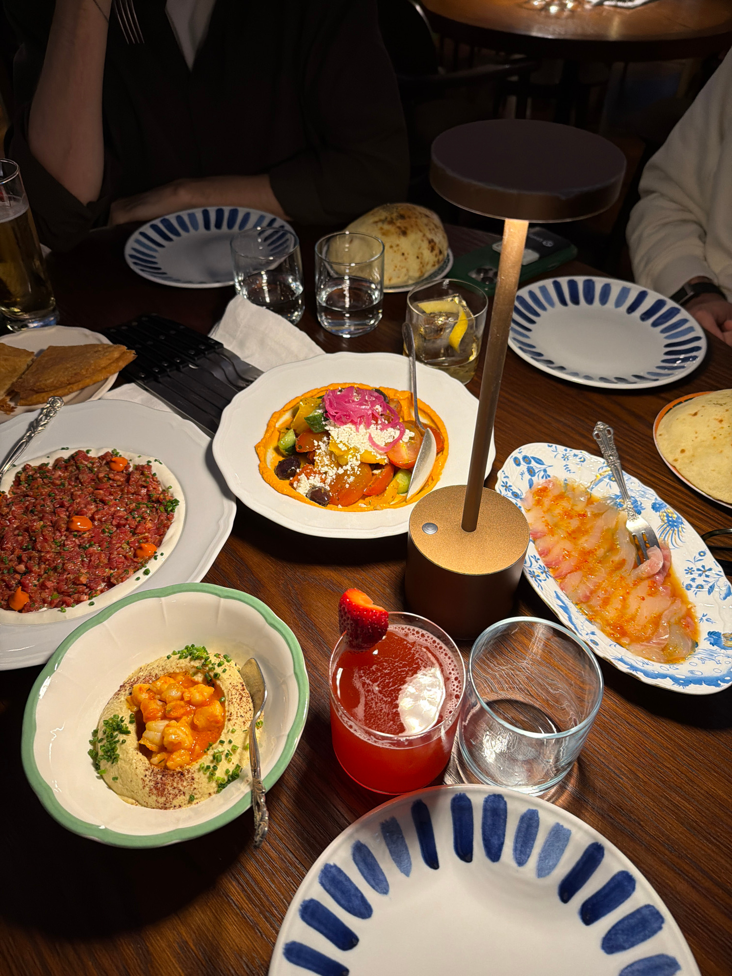 The image captures a dining scene on a wooden table. There are several plates of food including a salad with colorful vegetables and cheese, thinly sliced fish with sauce, a meat dish, and a dish of h…read more