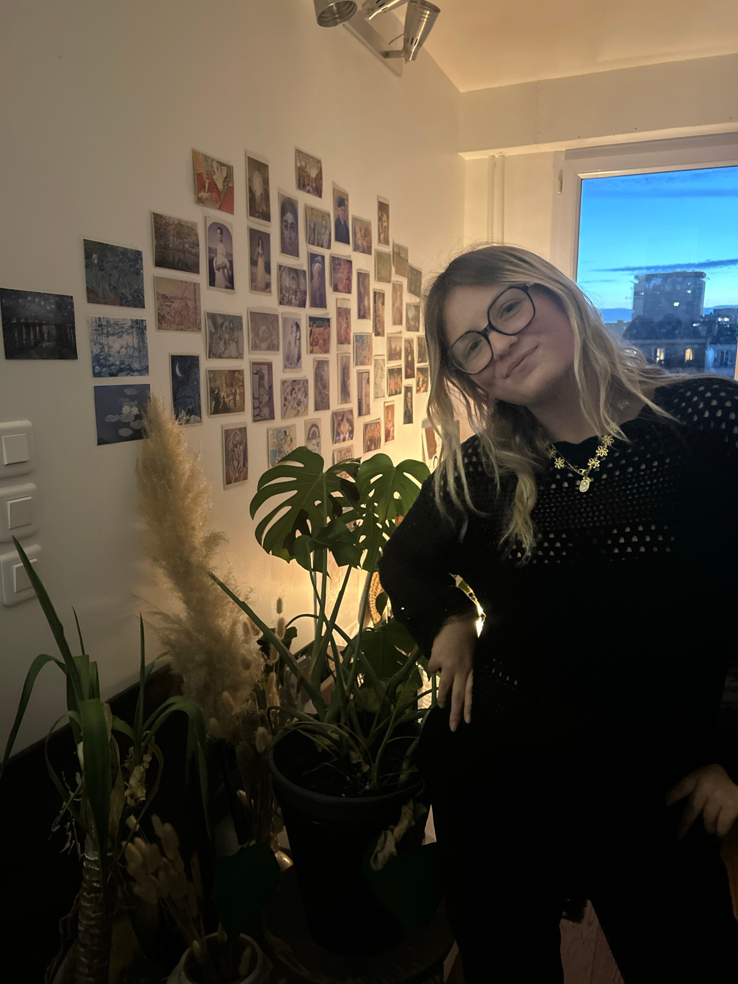 The image depicts a woman wearing glasses and a black top in an interior setting. Behind her is a wall decorated with numerous small images. To the right of the woman, there is a large houseplant with…read more