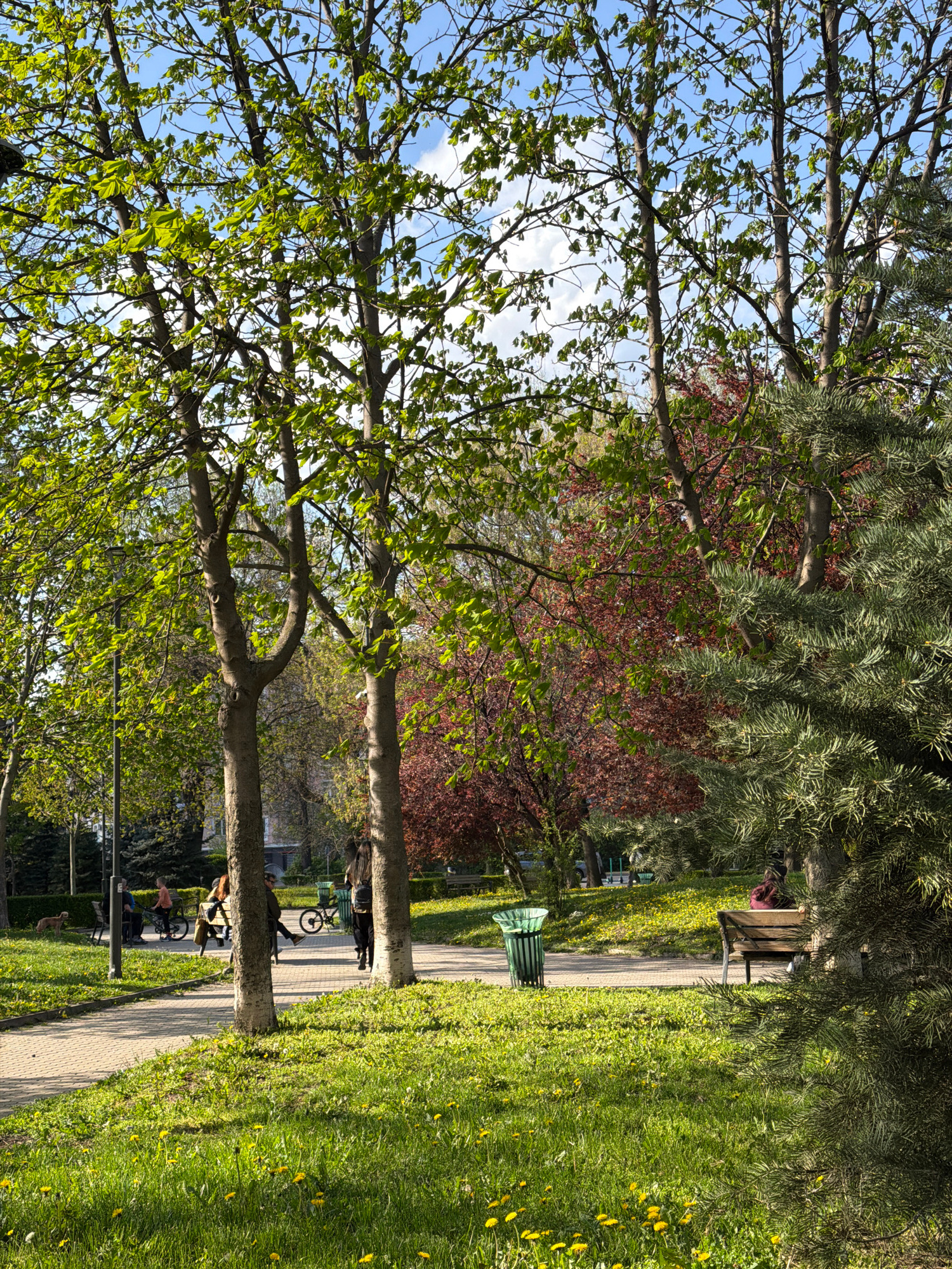 The image shows a park scene in Sofia, Bulgaria. The foreground features trees with new green leaves reaching towards a blue sky with scattered clouds. A paved pathway runs through the park, flanked b…read more