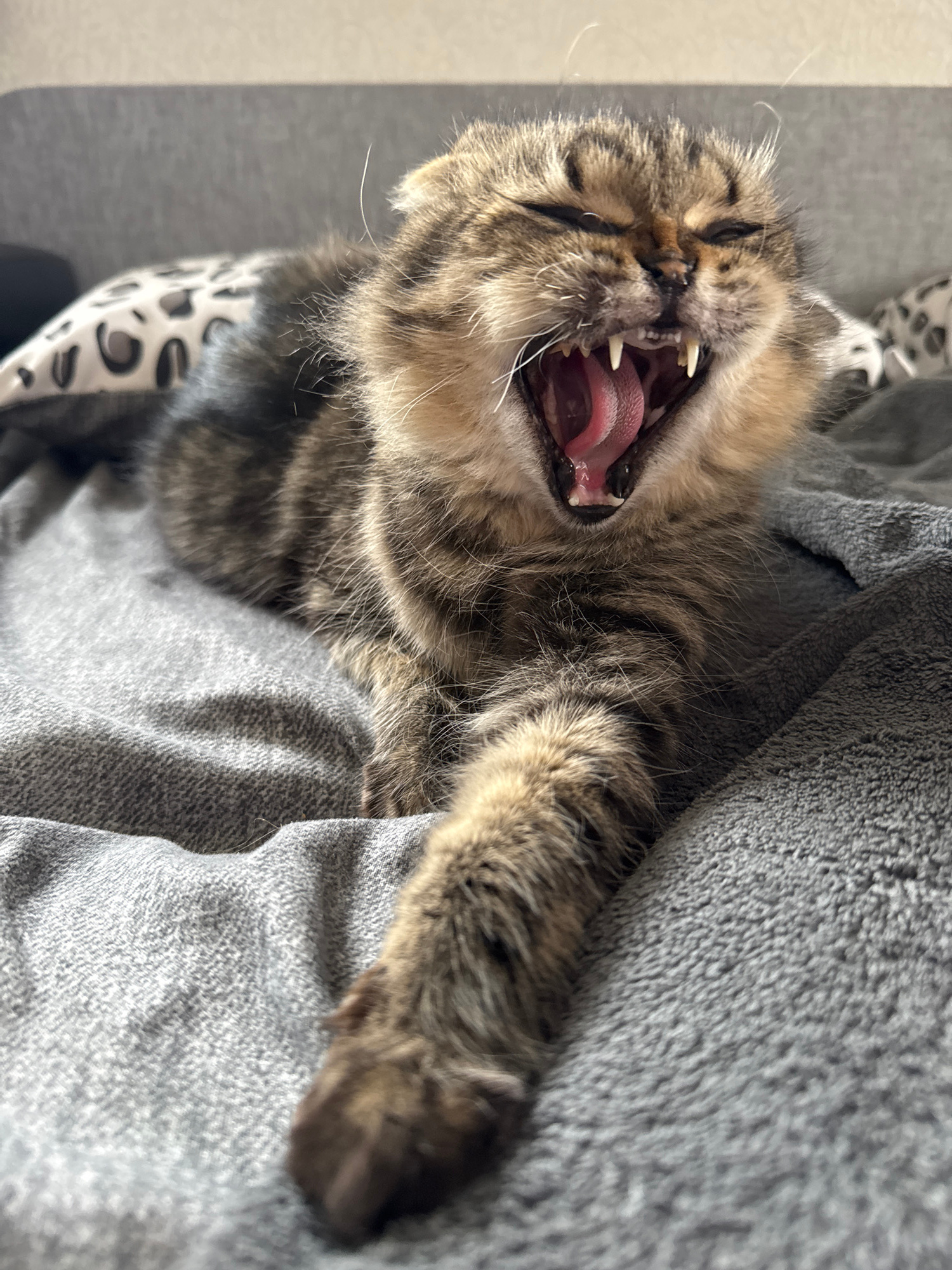 A close-up, tilted image shows a tabby cat lying on a gray blanket. The cat's mouth is wide open, revealing its teeth and pink tongue in a yawn or a possible hiss. Its eyes are closed or narrowed. A p…read more