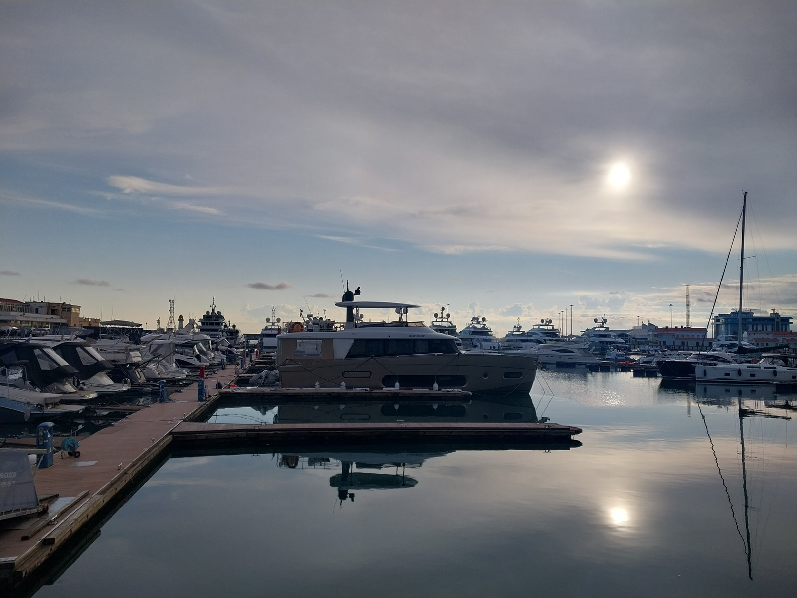 The image depicts a marina in Sochi, Russia. A modern yacht is docked at a floating pier in the foreground, its reflection visible in the still water. Numerous other boats, including sailboats and mot…read more