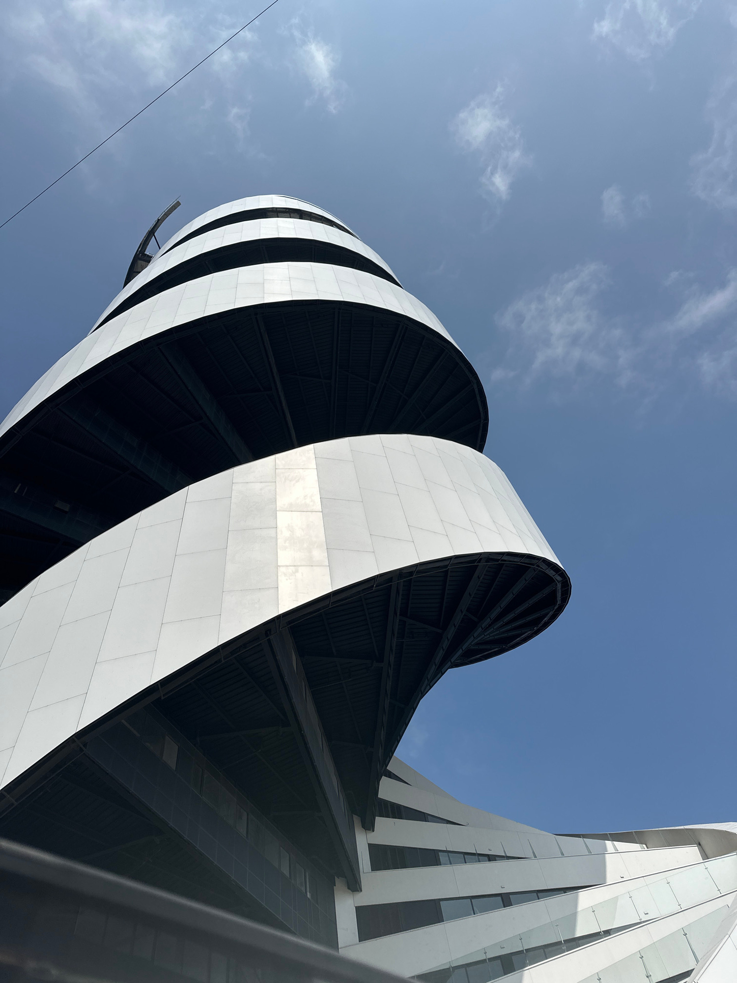 A low-angle shot showcases a contemporary architectural structure against a blue sky with scattered clouds. The building features a curved, spiral design with alternating white and dark gray bands. Th…read more