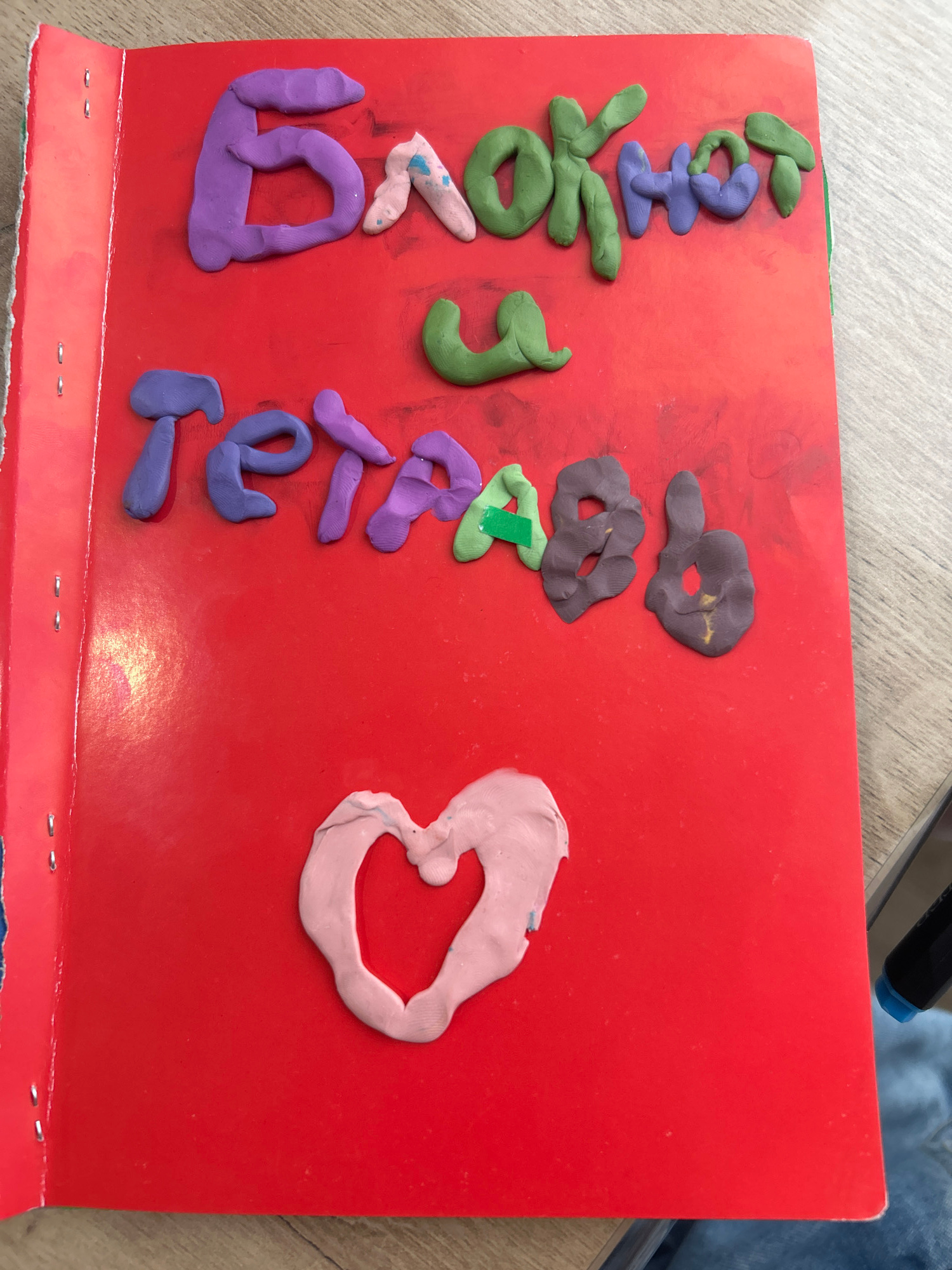 A red, stapled-edge notebook sits on a wooden surface. The notebook cover is decorated with colorful modeling clay shaped into what appears to be letters and shapes. From left to right, vertically, t…read more