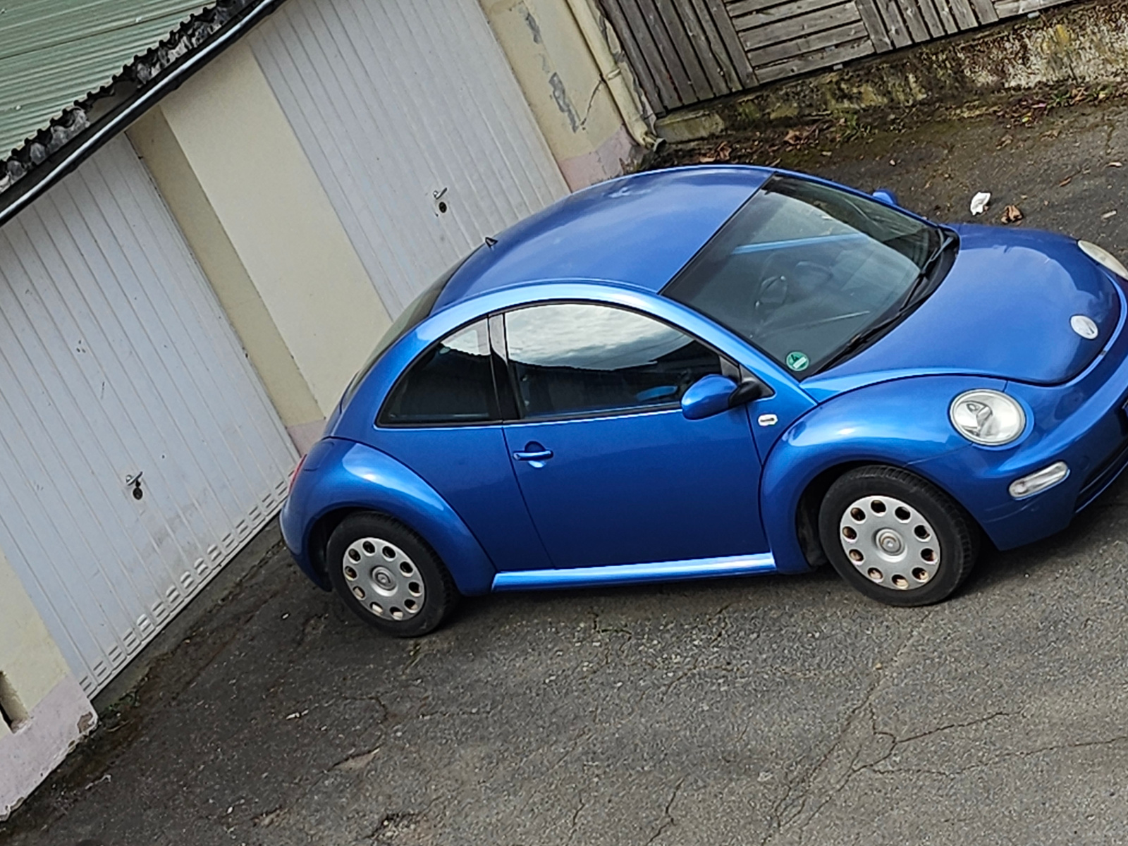 A blue Volkswagen Beetle is parked on asphalt beside a white garage with a green roof in Trier, Germany. A wooden fence sits adjacent to the garage. No people are visible. The asphalt is cracked.