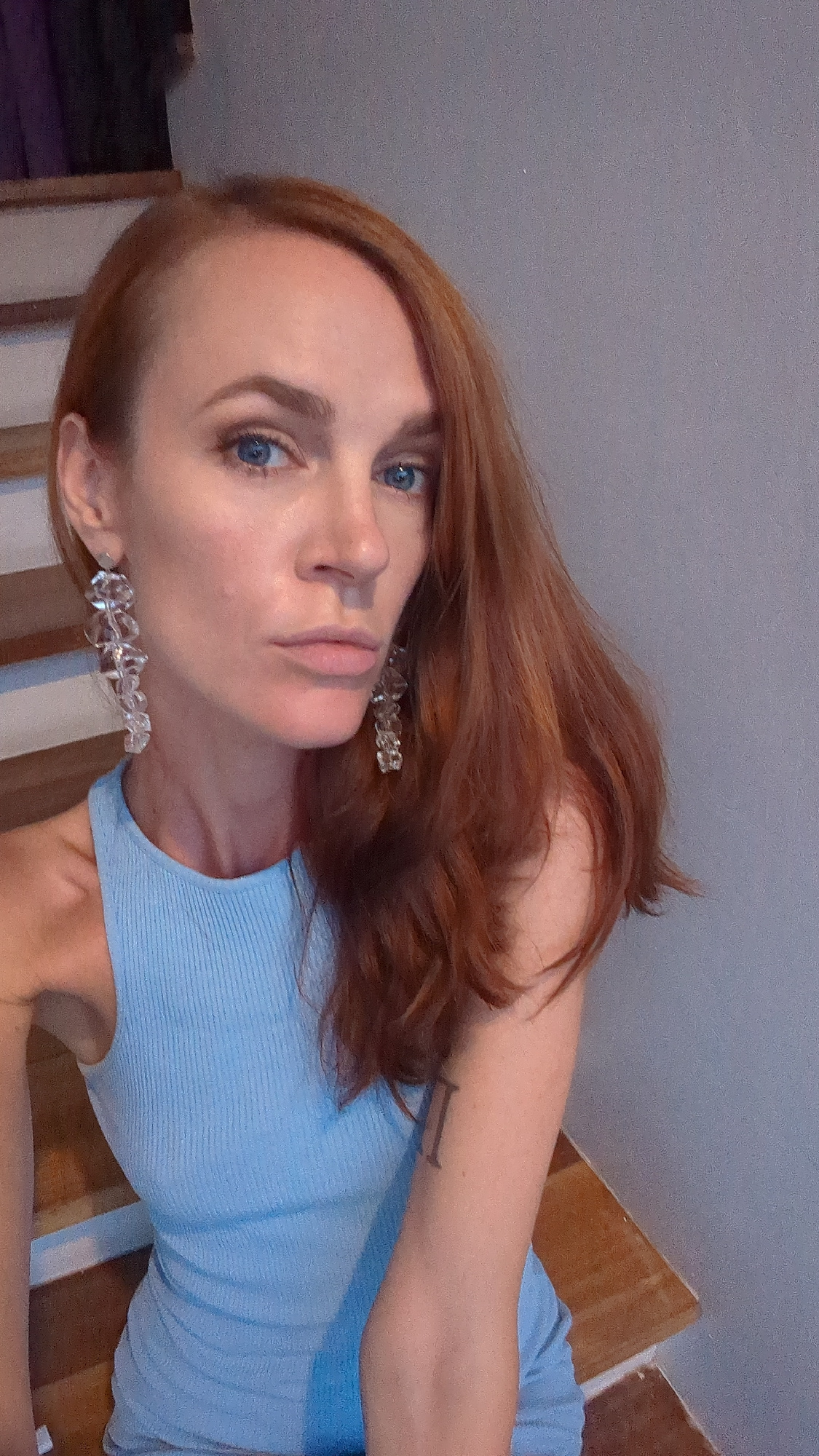 This portrait captures a woman looking directly at the camera, with the image rotated 90 degrees, showing her head tilted to one side. She has fair skin, bright blue eyes, and long, reddish-brown hair…read more