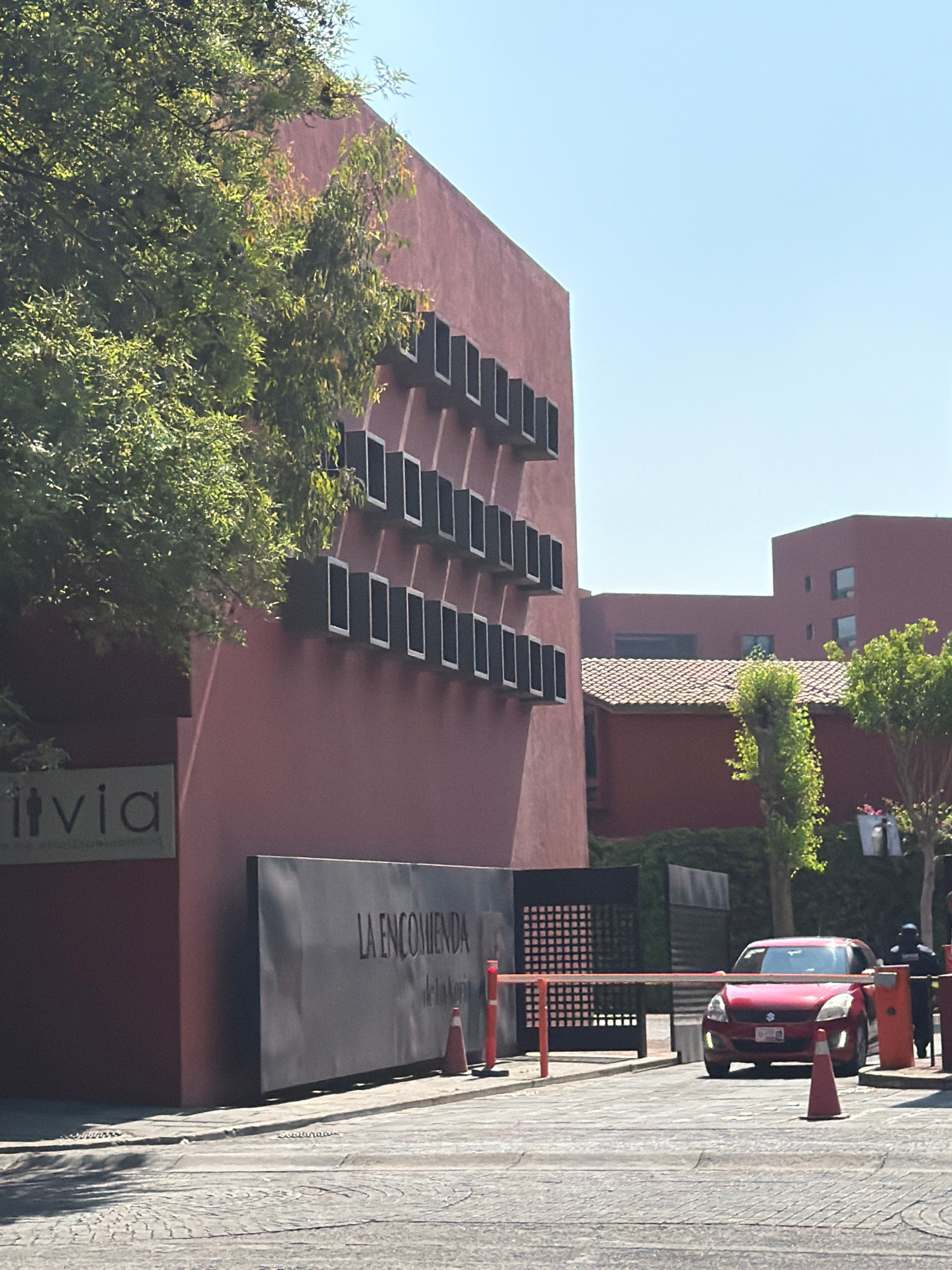 The image captures a street view in Puebla, Mexico, featuring the building "La Encomienda de la Noria." The building has a distinctive architectural design with multiple rows of square, box-like featu…read more