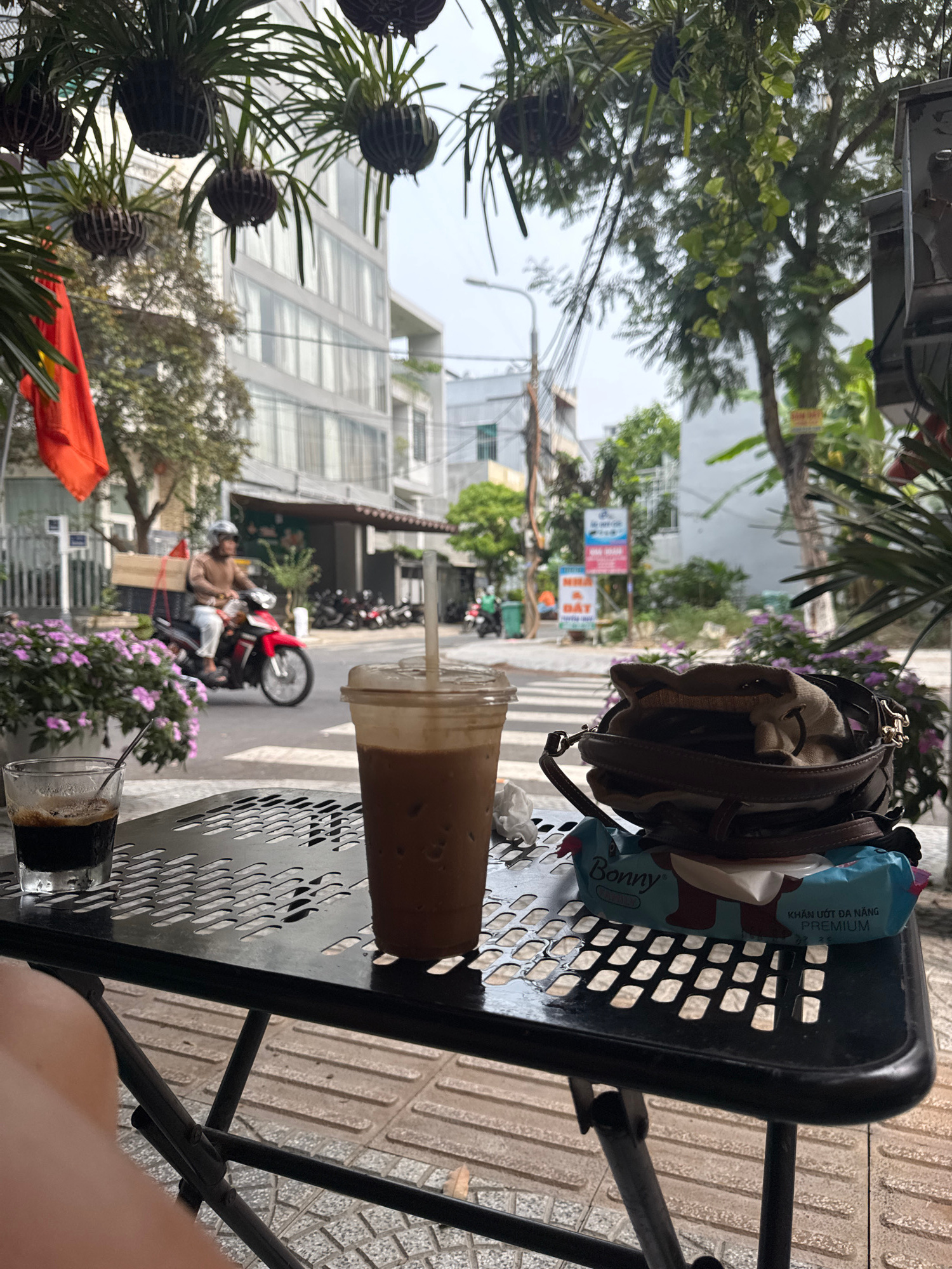 A medium-close shot angled toward a black metal table at an outdoor cafe in Đà Nẵng, Vietnam. On the table are a clear plastic cup of iced coffee with a straw, a brown purse, and a packet of wet wipes…read more