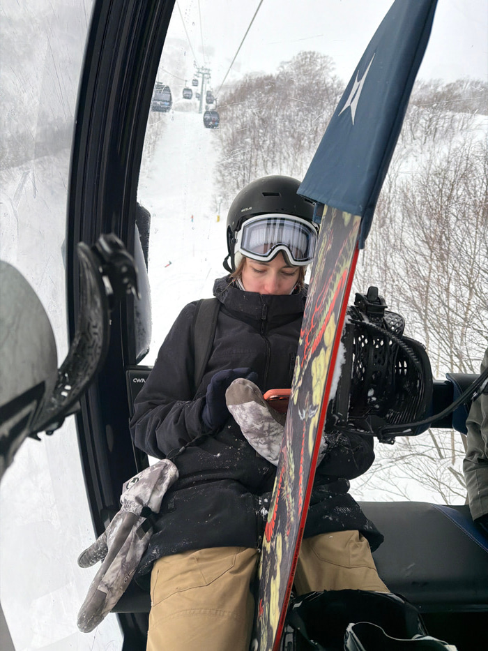 Inside a ski lift, a person wearing a helmet and goggles is seated, holding a snowboard. The snowboard has black bindings and a colorful graphic design. They are wearing a black jacket, beige pants, a…read more