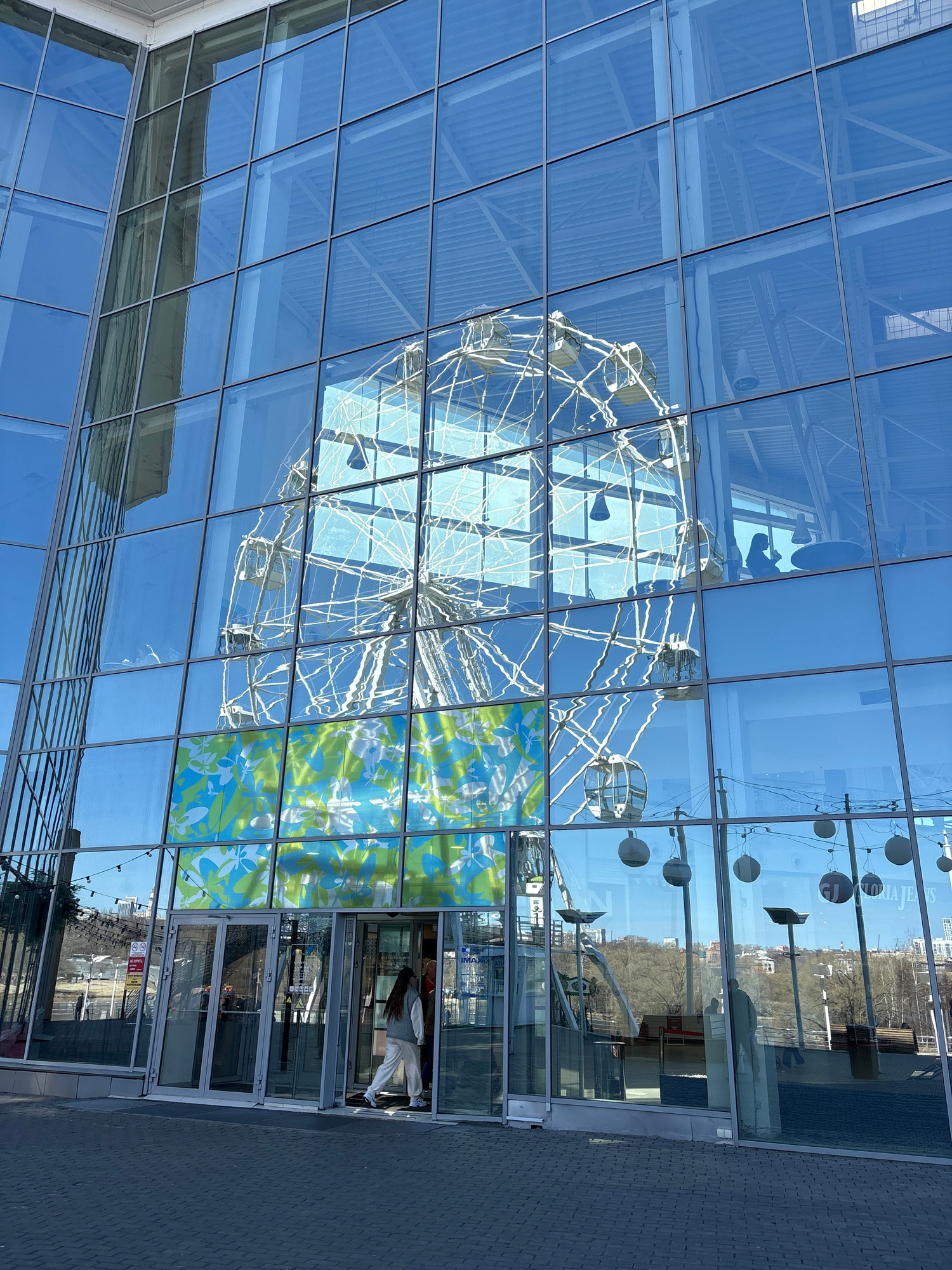 The image shows a building with a glass facade reflecting various objects. Reflected in the glass are the sky, part of a metal Ferris wheel structure, street lamps, and part of a landscape with trees.…read more