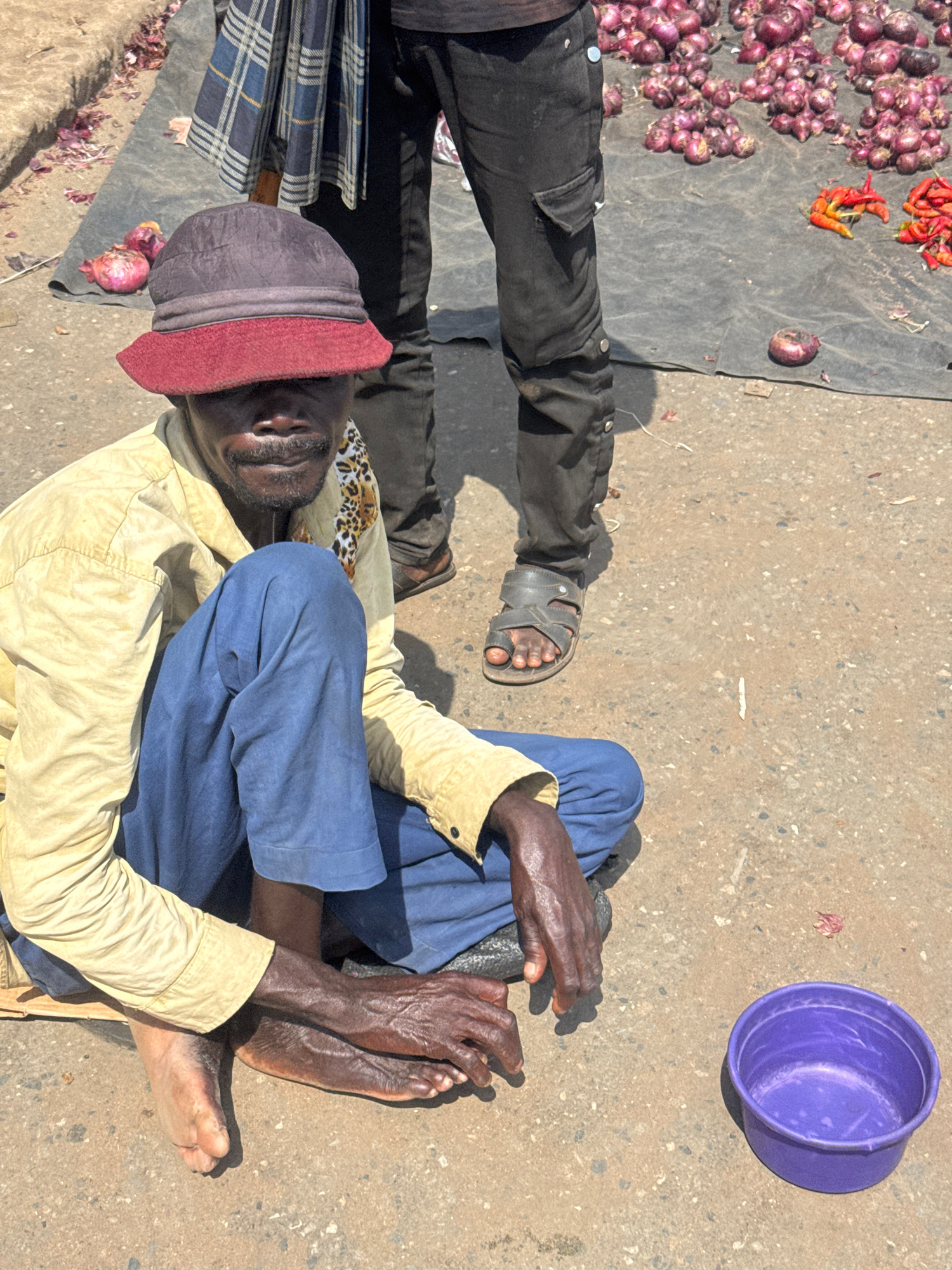 This overhead shot depicts an outdoor market scene in Onitsha, Nigeria, under bright, direct sunlight, casting strong shadows. The central figure is an older man seated on the ground with his legs be…read more