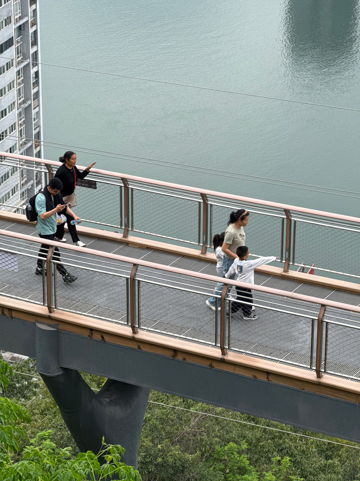 The image shows an elevated walkway in Yuzhong District, China. The walkway is constructed of metal and wood, with wire mesh railings. It is supported by a large gray metal beam, which is visible on t…read more
