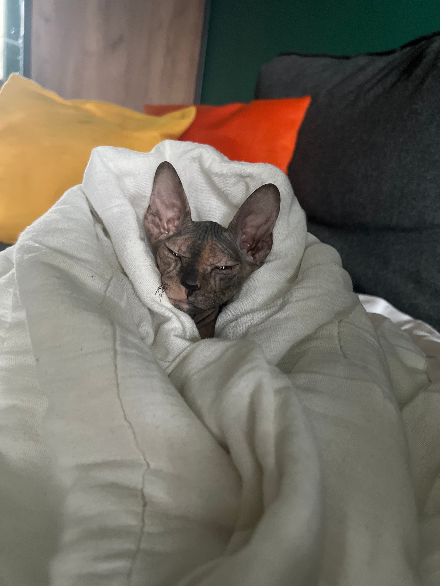 A Sphynx cat is seen nestled and partially wrapped in a soft, white blanket, appearing cozy and perhaps a bit sleepy. The cat's head is visible, with its characteristic wrinkled skin and large ears. I…read more